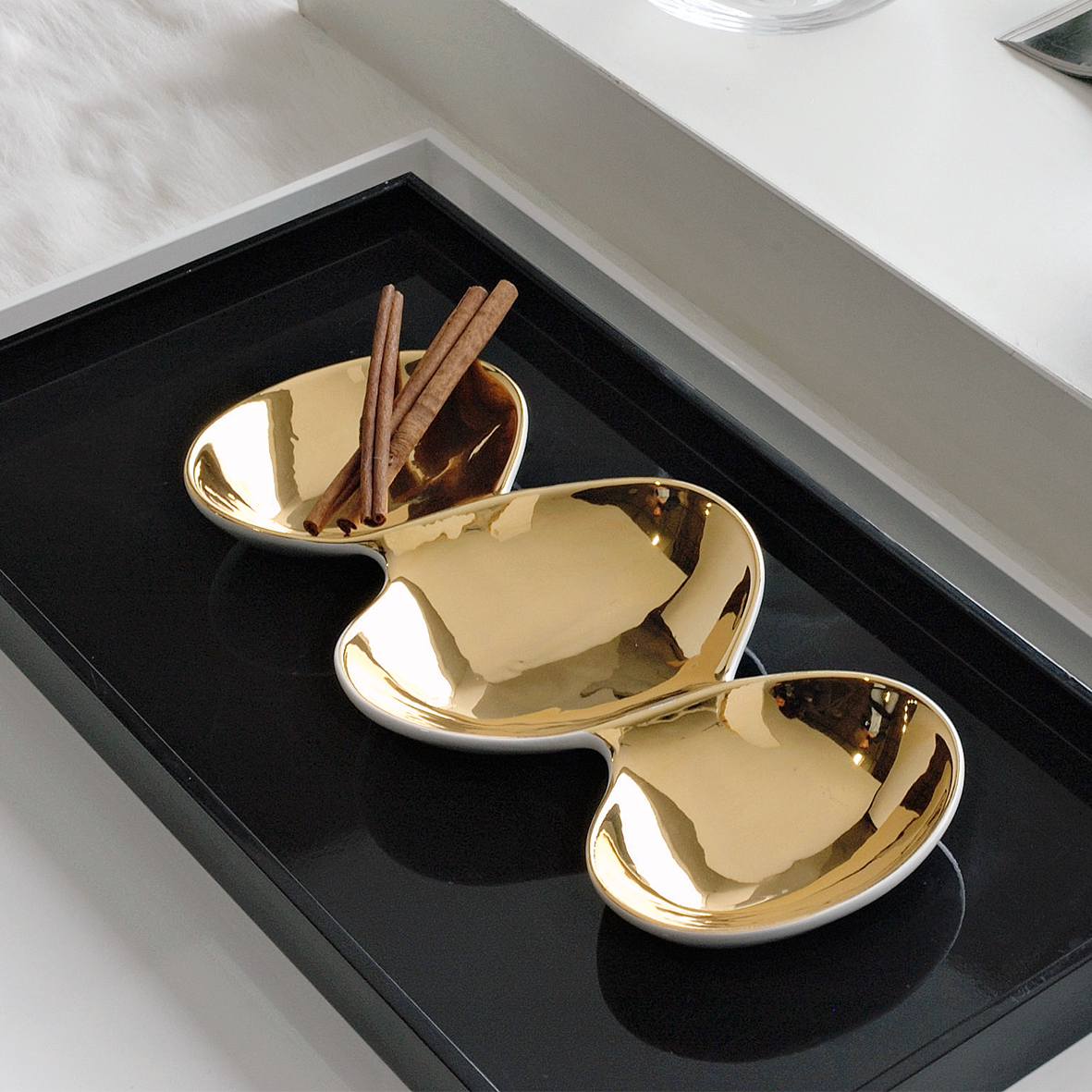 這款醬料盤以流動的液態線條為靈感,打破了傳統餐瓷的僵硬結構。三個優雅相連的圓弧托盤,不僅展現了陶瓷材質的極致延展性,其內部閃耀的亮面釉彩裝飾,更在光影下呈現出如珠寶般的奢華質感。這不僅是一件實用的餐桌器皿,更是一件足以提升宴飲層次的桌上藝術雕塑。