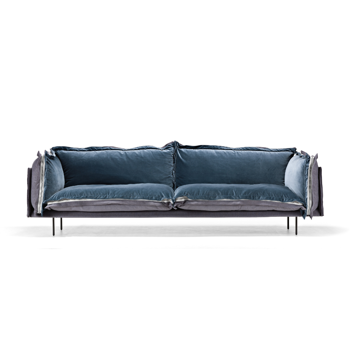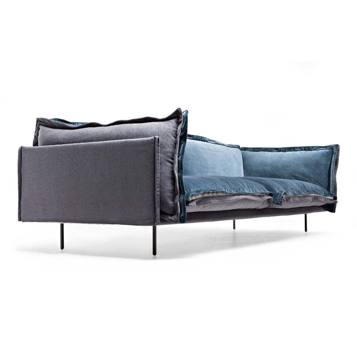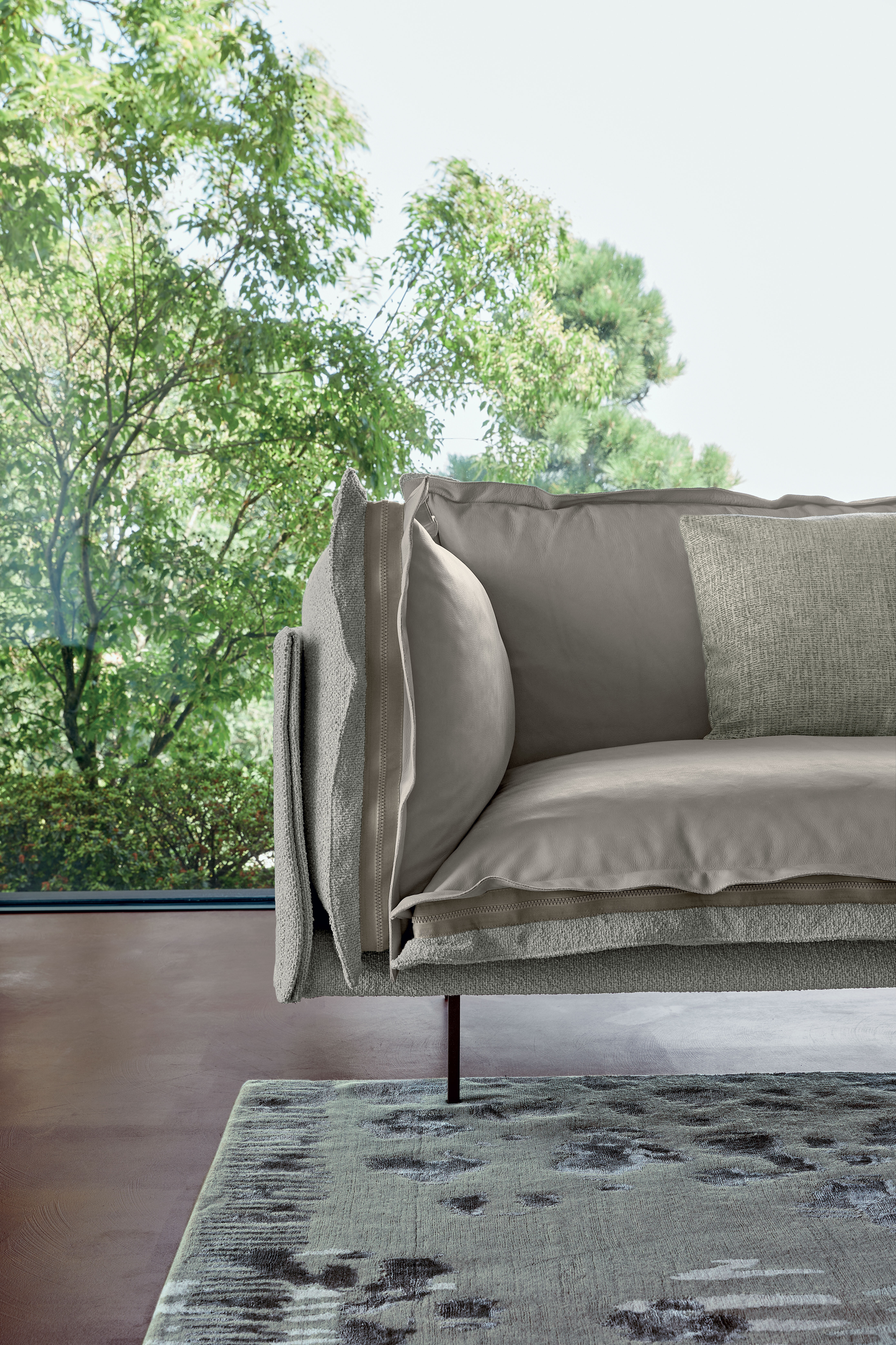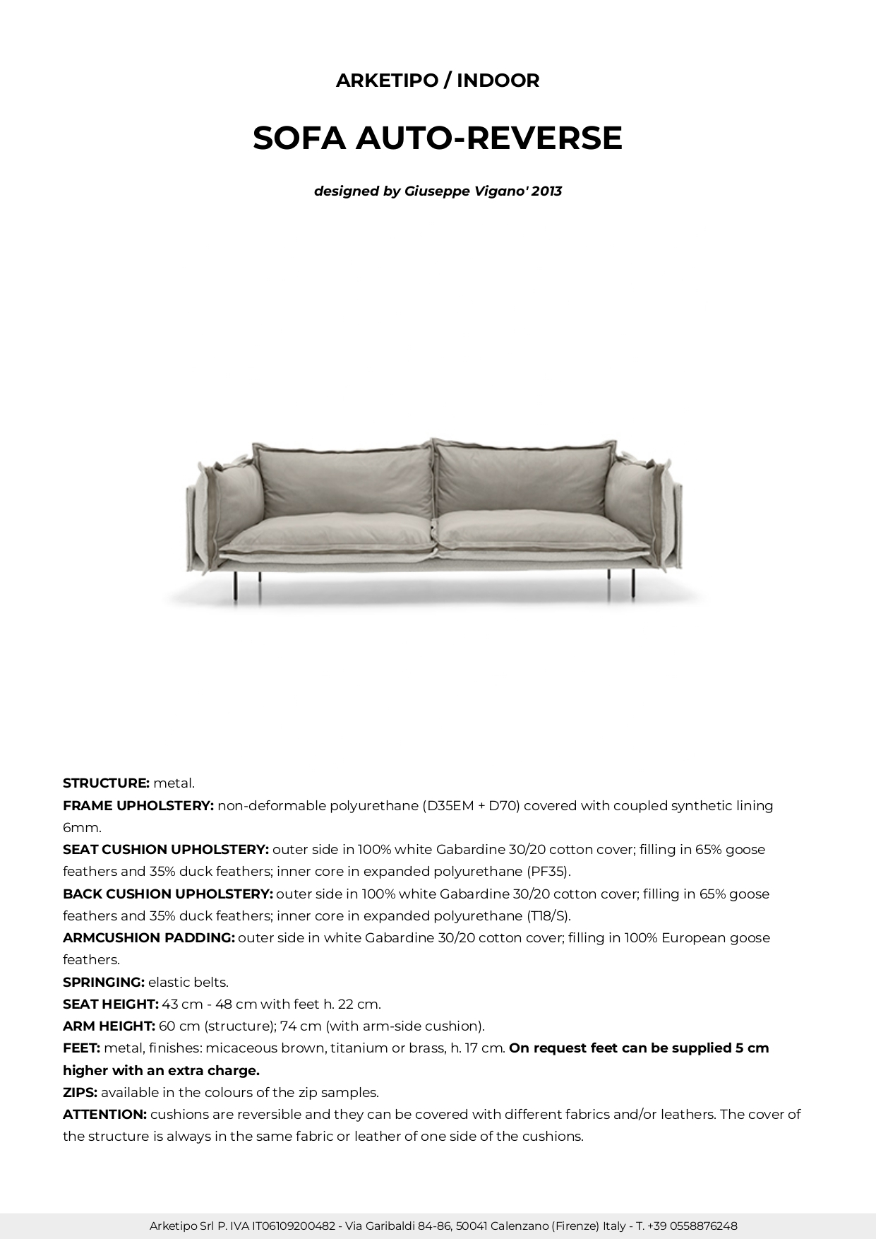 Auto-reverse 沙發散發強烈的個性,創作靈感源於設計師想在生活區域表達雙重靈魂的想法,因此在看似休閒放鬆的外觀下,對於沙發的每個細節與順序極度謹慎,設計出風格鮮明的高品質沙發。其輕薄的結構,優雅時尚的外觀,以及荷邊裝飾,緊貼墊子四面的拉鍊,創造觸覺和視覺上的舒適感,將柔軟溫暖的面料與皮革的優雅共存,更以懸浮為元素,透過金屬製纖細椅腳,讓沙發彷彿飄浮地面之上。