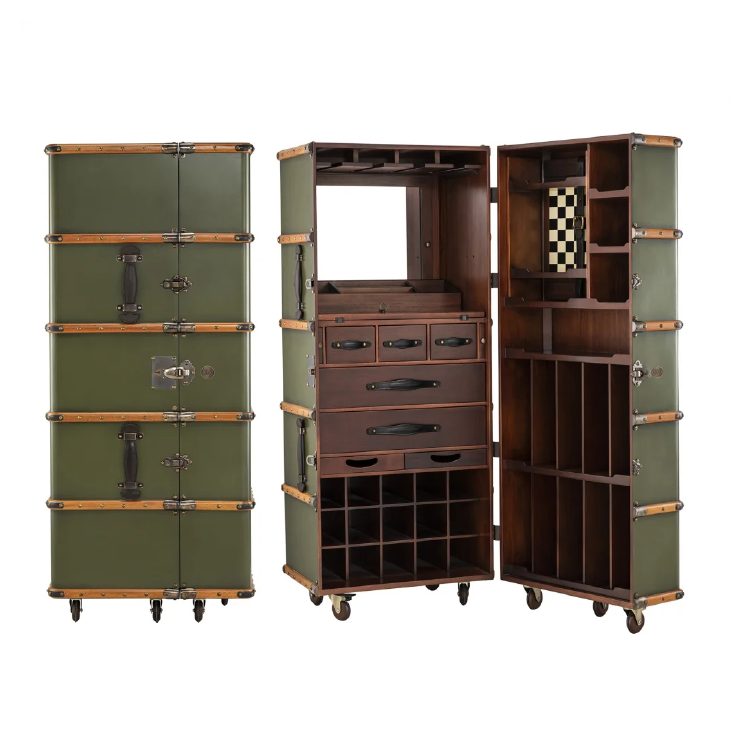 樂趣和功能融合成令人印象深刻的歷史比例。酒吧里的輪子。將其停放在附近的某個地方並將其鎖定!採用世紀之交旅行箱的風格製成。堅固的黃銅配件和韁繩皮革配件構成了一個手工製作的兩部分桿,位於一個配有堅固輪子的大行李箱內。多個抽屜、兩個托盤、水平和垂直瓶子的架子。鏡子和折疊工作架。取出右側的架子即可釋放出可移動的遊戲板。標誌性的。當狩獵只需要手邊的馬提尼酒或威士忌酸酒時,充滿自信地喚起美好時代的回憶!