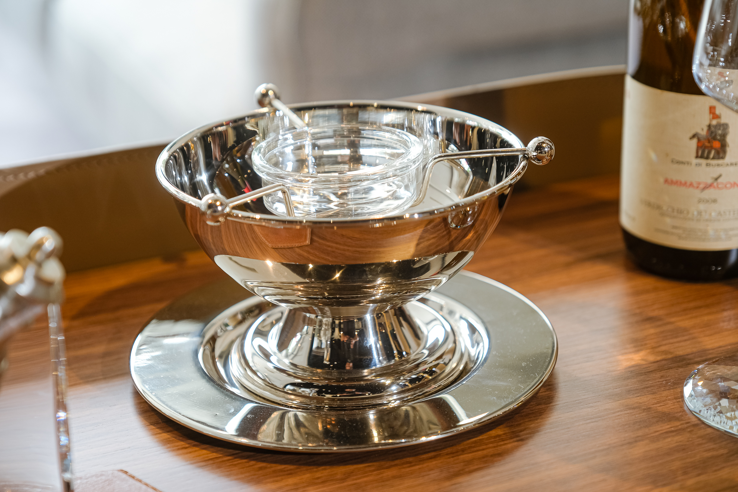在精緻餐飲(Fine Dining)的歷史中,享受魚子醬是一場關於溫度與儀式的藝術。這款魚子醬保冷碗採雙層設計:下層寬大的金屬碗座用於盛裝碎冰,上層則嵌套清透的玻璃內碗。透過碎冰的環繞與金屬極佳的導冷性能,確保每一顆魚子醬都能維持在最佳的冷冽鮮甜,避免室溫破壞其細膩的風味。