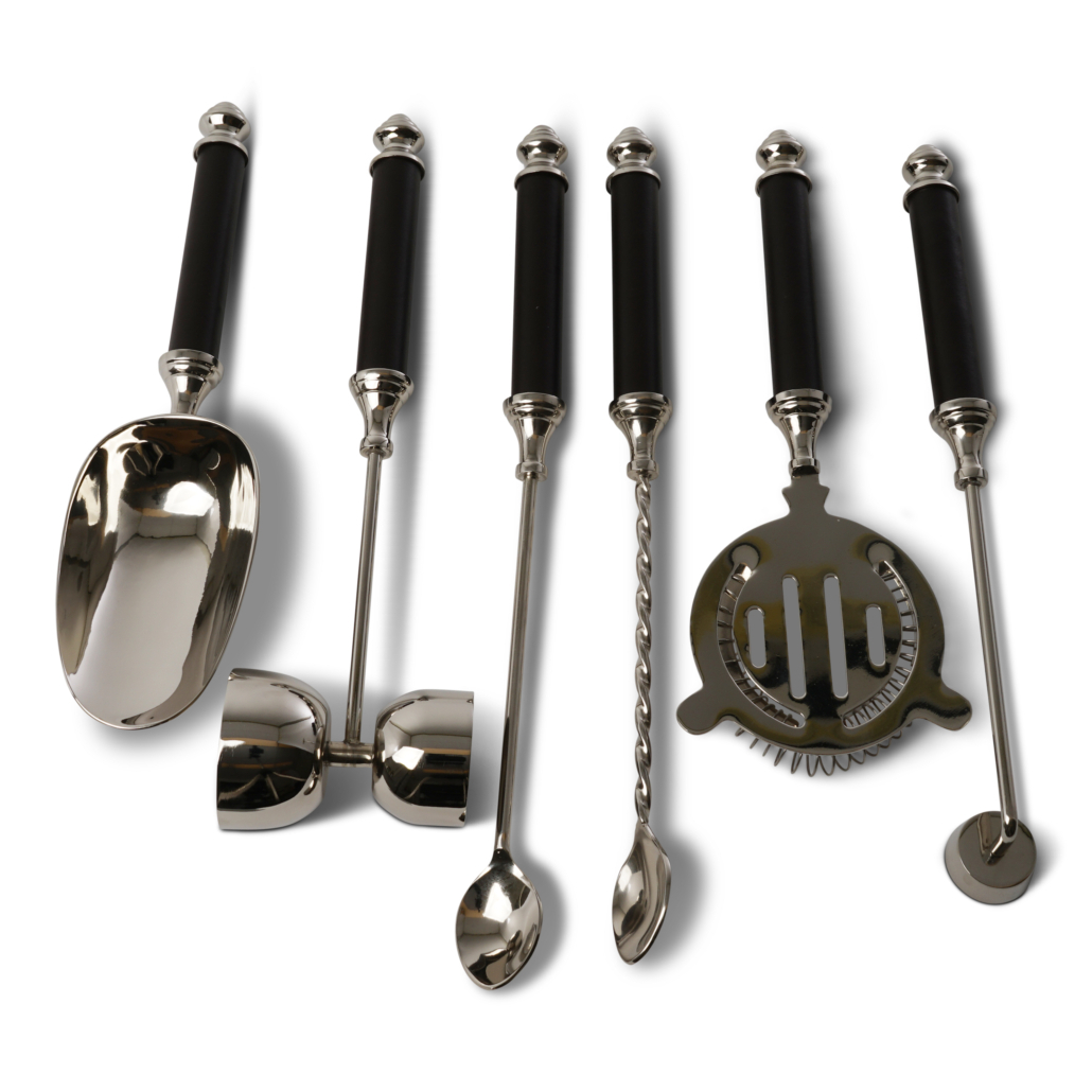 這款調酒組以優雅的復刻工藝,讓您在家也能瞬間化身為技藝精湛的調酒師。全套包含量酒器、濾冰器、攪拌勺等專業工具,每一件皆具備洗鍊的金屬光澤與手工皮革裝飾把手,不僅提供了絕佳的抓握感,更在每一次旋轉與搖盪間,重現 20 年代黃金時期的紳士社交格調。
