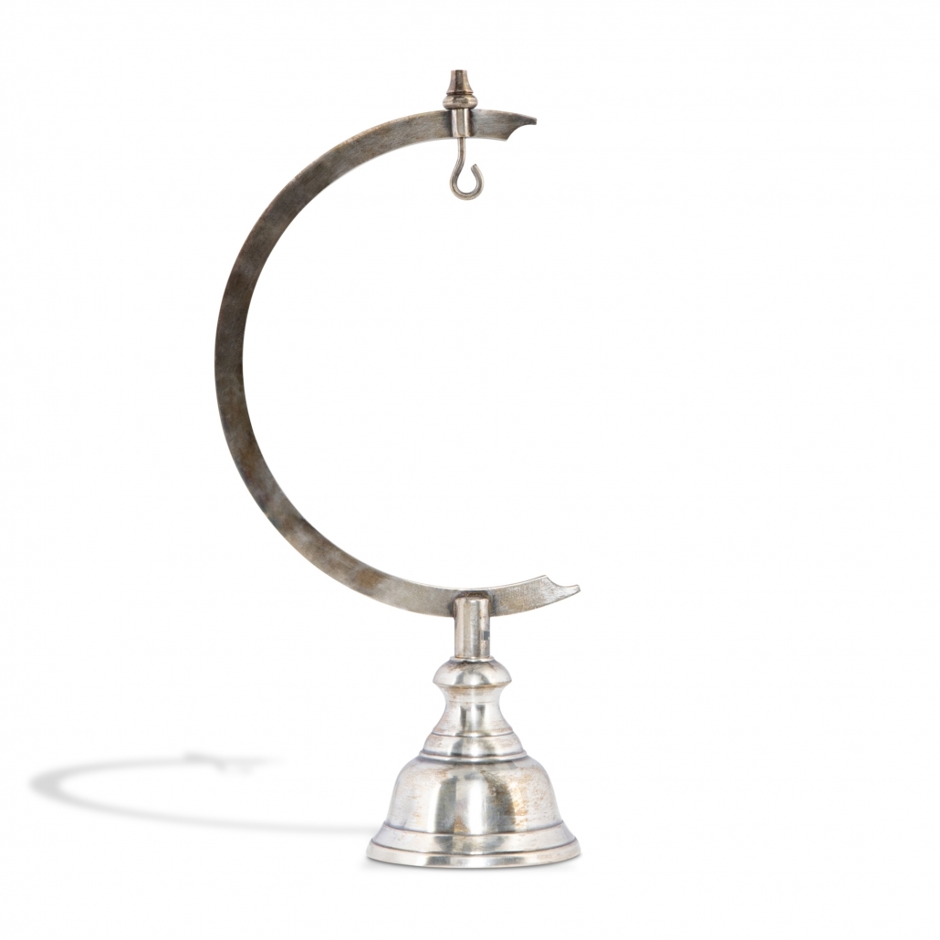 這款掛架以經典的銀色拋光飾面打造,是專為展現「時光之眼」球形鐘立體美感而生的藝術底座。優雅的 C 型半圓弧線條讓時鐘如同航海儀器般優雅懸浮,不僅能從各個角度輕鬆讀取時間,更透過金屬特有的冷冽光澤,為您的案頭營造出一抹知性的復古氣息。
