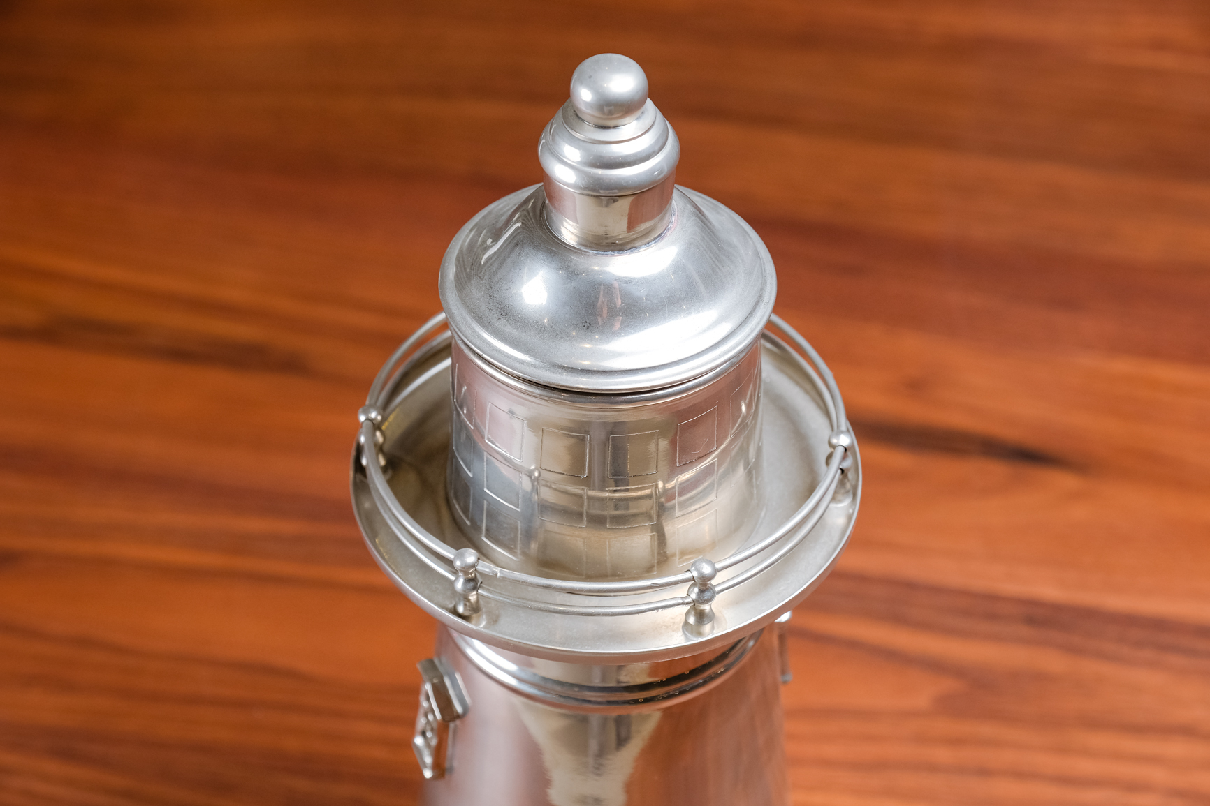 這款以「波士頓燈塔」為原型的雪克杯,帶領我們重返 1920 年代美國禁酒令的狂放歲月。當時法律嚴禁釀造與販售酒類,為了躲避警察的緝查,地下酒吧(Speakeasy)發展出各式造型奇特的調酒工具,將雪克杯偽裝成燈塔、飛彈或飛艇等裝飾品。