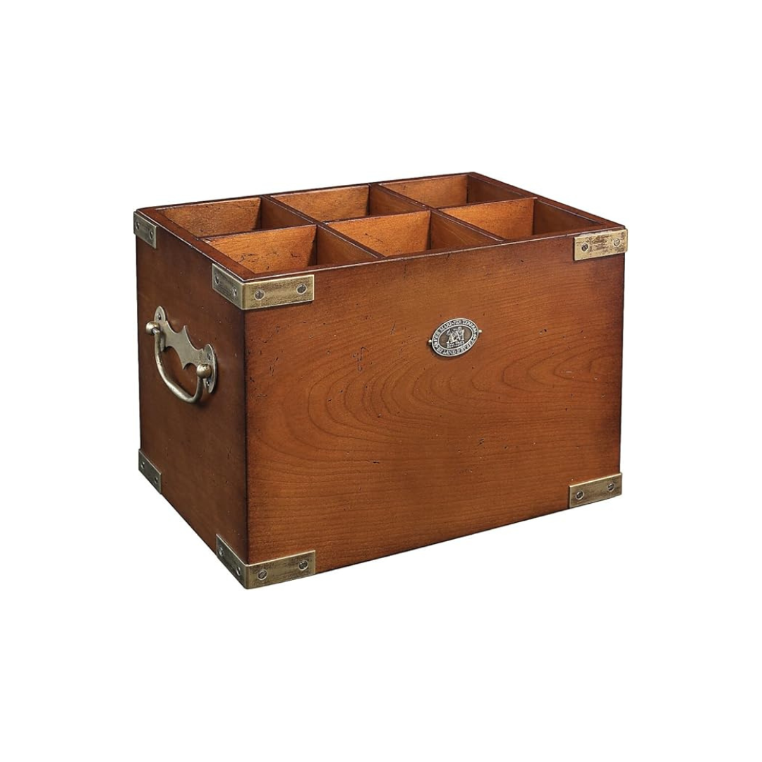 酒箱採用實木打造,箱體四周鑲嵌有手工鉚接的黃銅護角,不僅加固了結構,更散發出迷人的古董質感。側邊配置的經典提把,讓您能優雅地將珍藏的六支佳釀移動至露台、書房或私人聚會中。箱身上細緻的 AM 品牌金屬標牌,標誌著其不凡的出身與對歷史工藝的堅持。