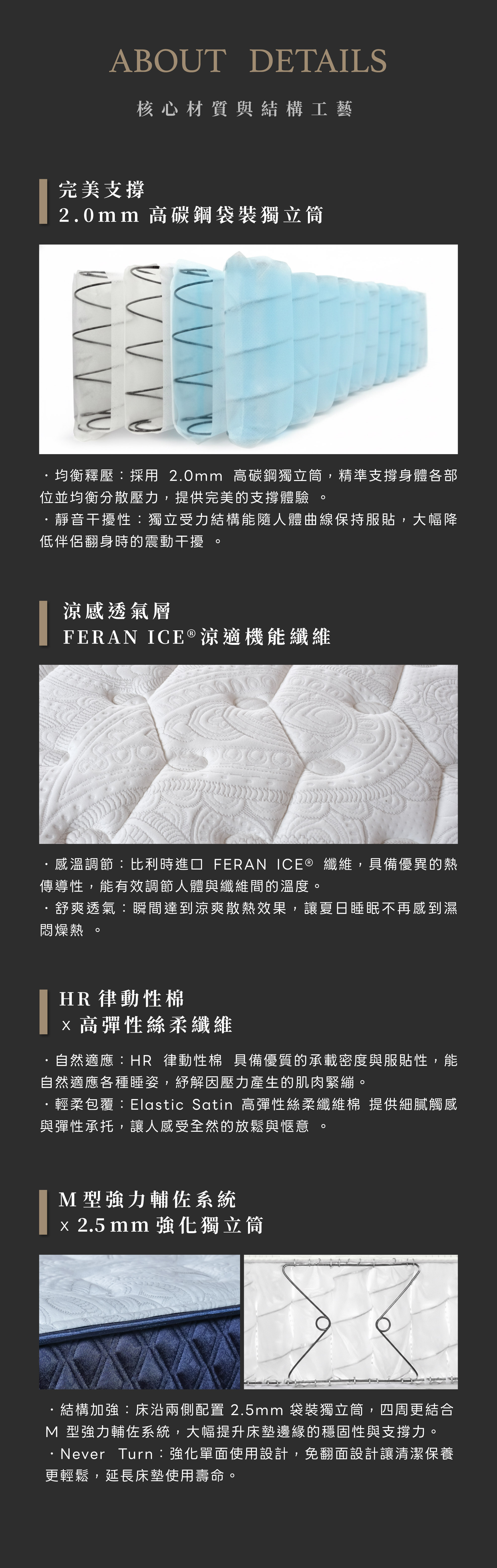 選用比利時 FERAN ICE® 涼感機能布,能迅速導熱並排除悶熱,長效維持清爽膚觸。內層整合高彈性絲柔棉與 HR 律動性棉,在柔軟包覆中提供穩定的支撐回彈。核心配置 2.0mm 高碳鋼獨立筒,精準承托身體曲線並維持脊椎自然伸展;針對床沿搭載 M 型強化結構與 2.5mm 輔助彈簧,確保邊緣穩固耐用、不輕易滑落側翻。這是一款專為五星級體感打造的高品質床墊,讓您在涼感與穩定支撐中,享有深層放鬆的眠境。