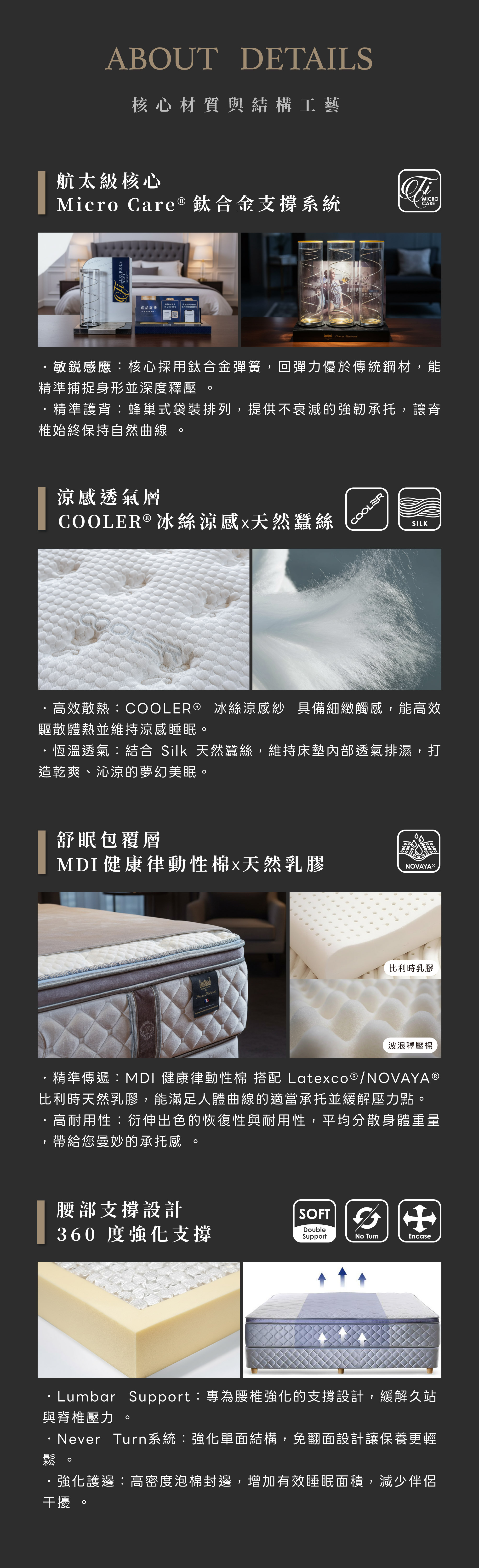 表層整合 COOLER® 冰絲 與 天然蠶絲,利用高傳導纖維持續排除體熱,結合藍銀織紋的細膩質感,維持整夜清爽膚觸。內層採用 MDI 健康棉 搭配 NOVAYA® 比利時天然乳膠,提供高度服貼的包覆感並精準釋放全身壓力,搭配腰部加強設計,確保脊椎自然舒展。