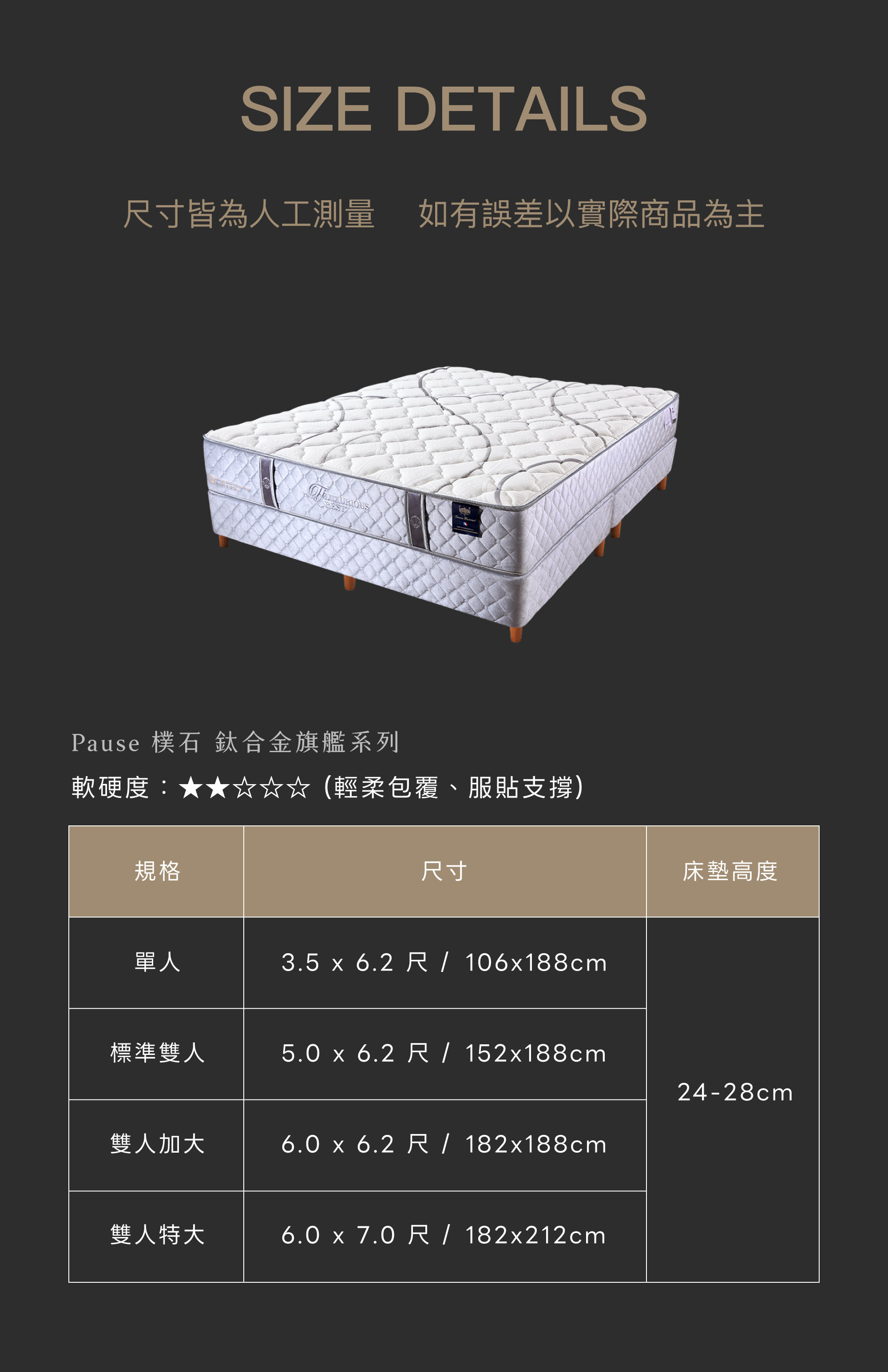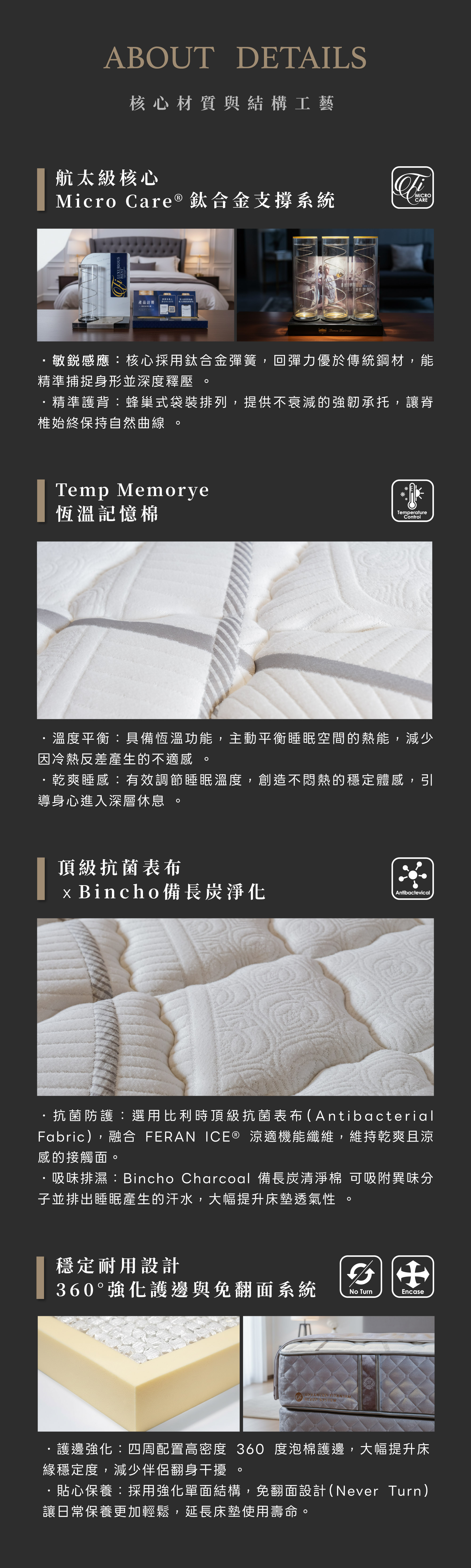核心搭載 Micro Care® 鈦合金獨立筒彈簧,以輕盈且感應敏銳的彈性精準分散身體重量,達到柔韌承托的護脊效果。四周配置 360 度高密度泡棉護邊,不僅免除定期翻轉床面的繁瑣,更大幅提升床沿穩定度並減少伴侶翻身干擾,為您打