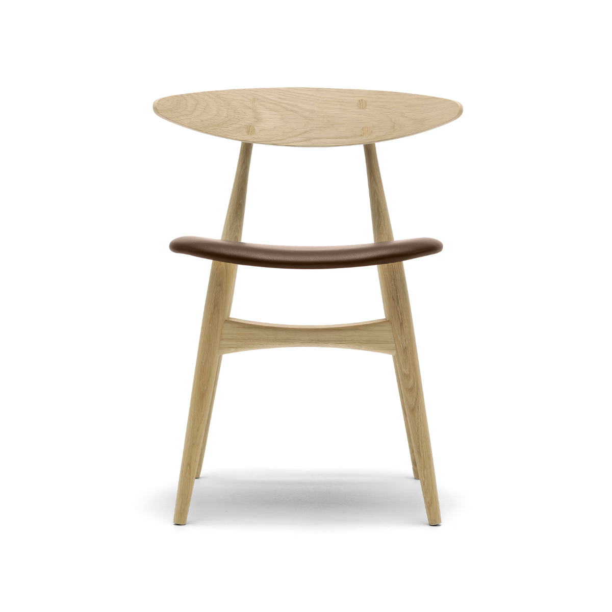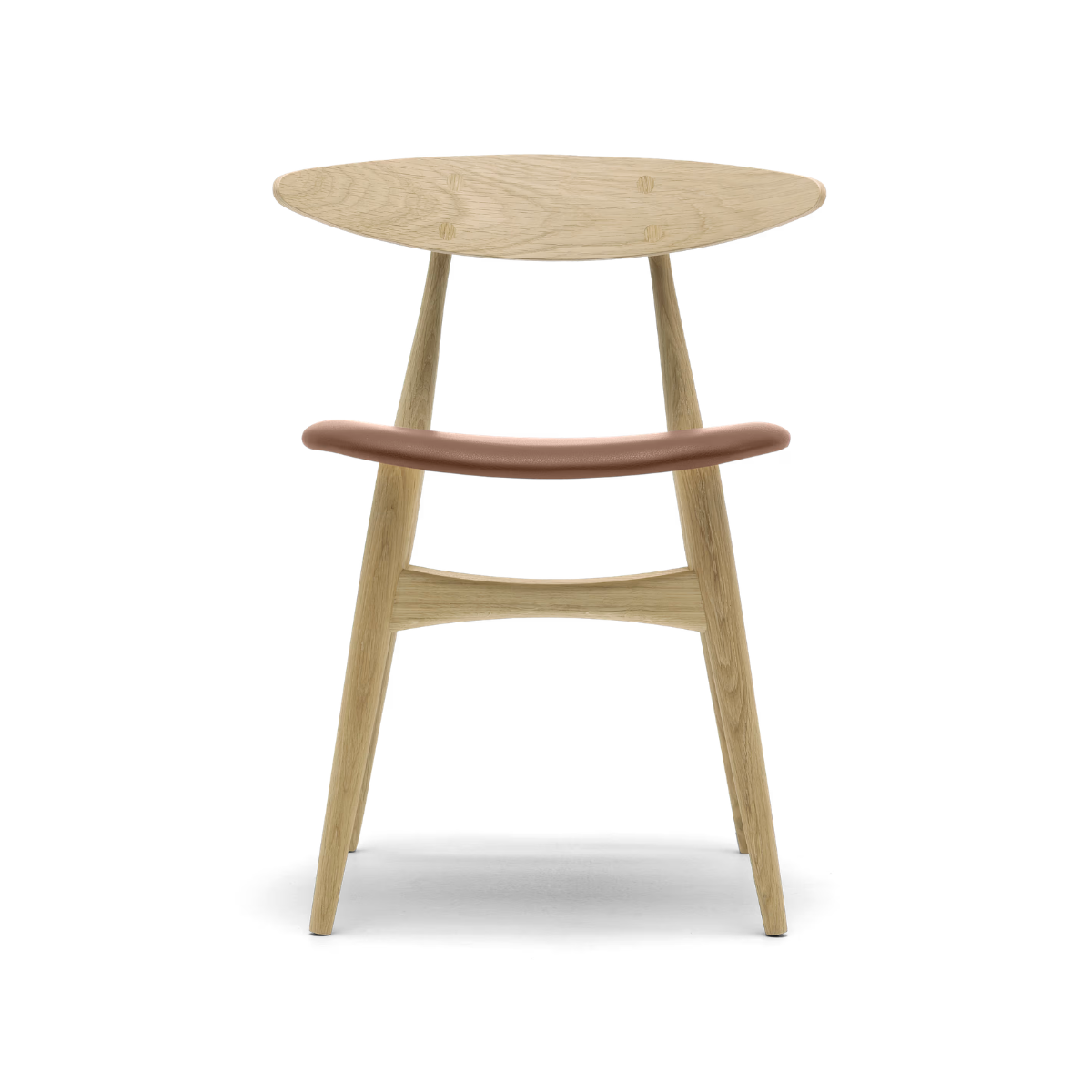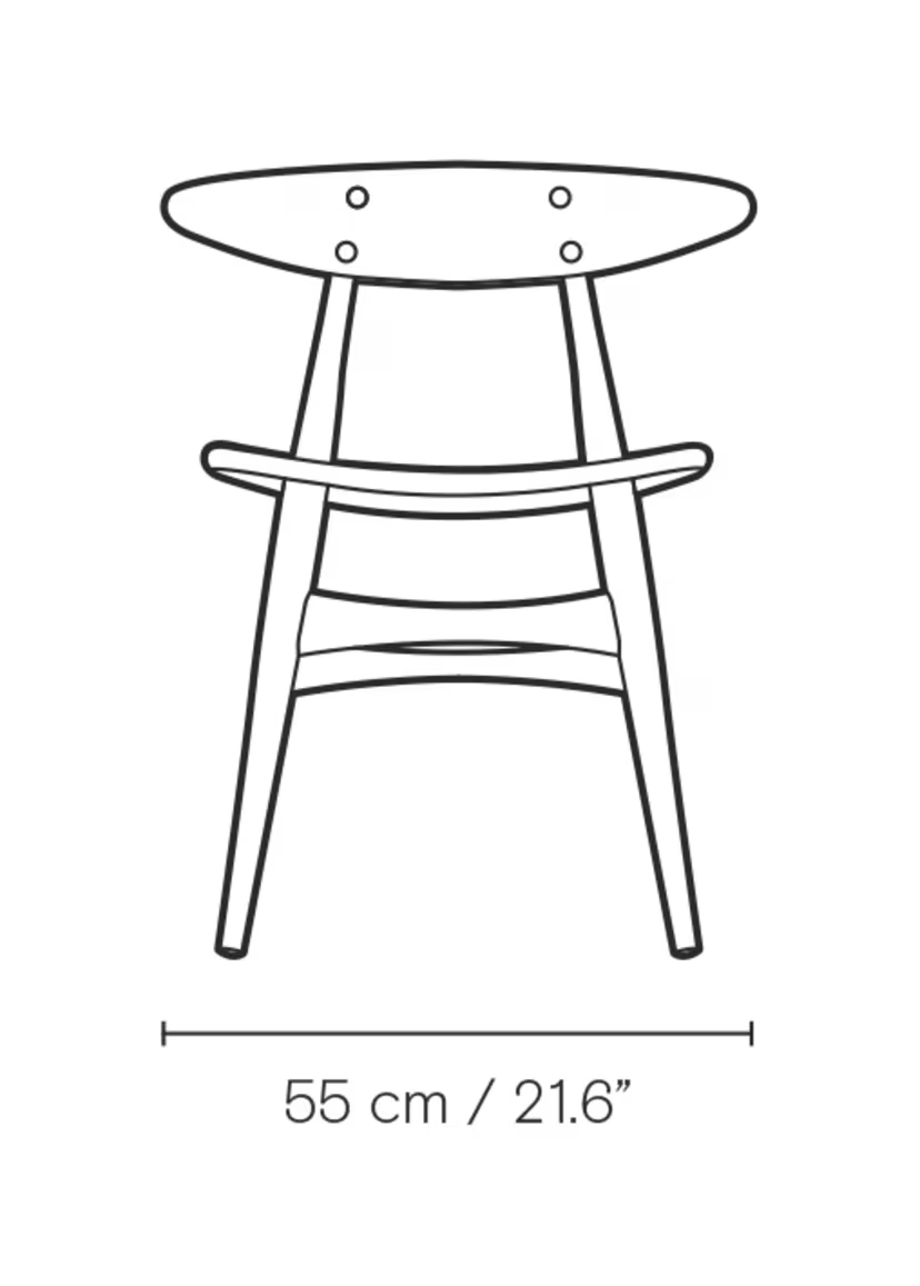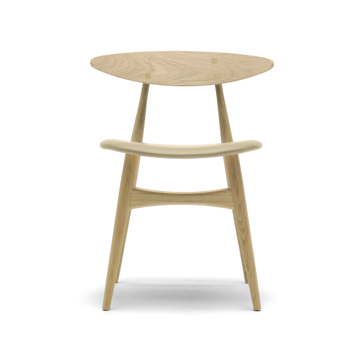 標誌性的弧形靠背採模壓成型夾板製作,表面可見圓形木釘蓋,是 Wegner 將工藝細節轉化為設計語彙的一貫手法。正面看來輕薄優雅,結構卻十分紮實,支撐性與美感兼顧。
