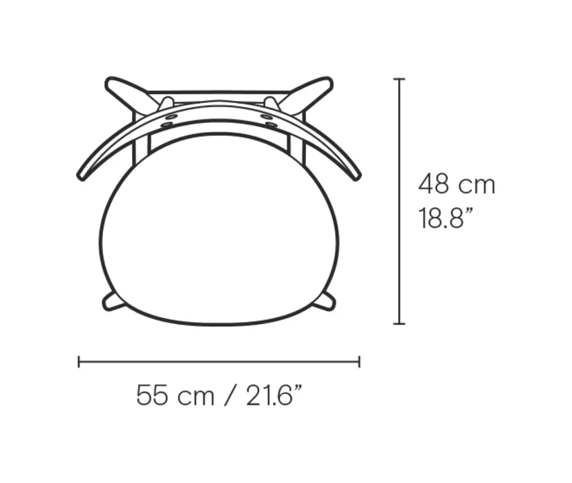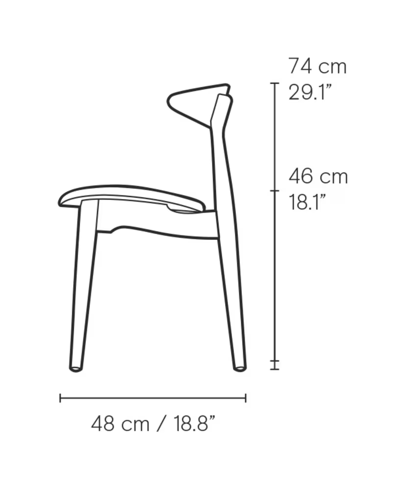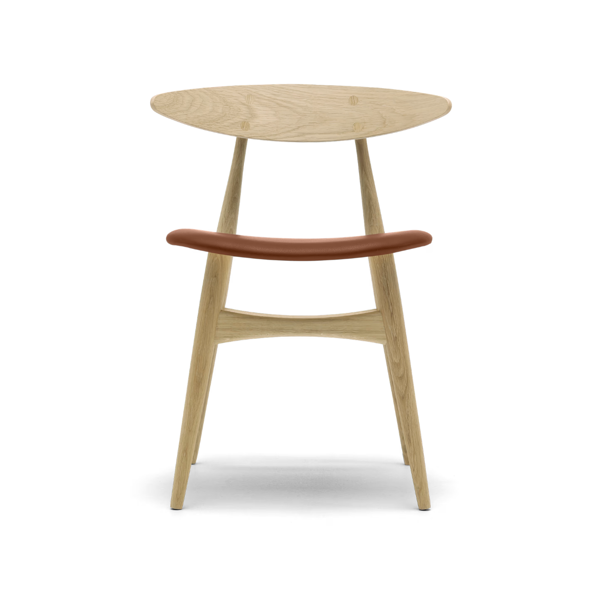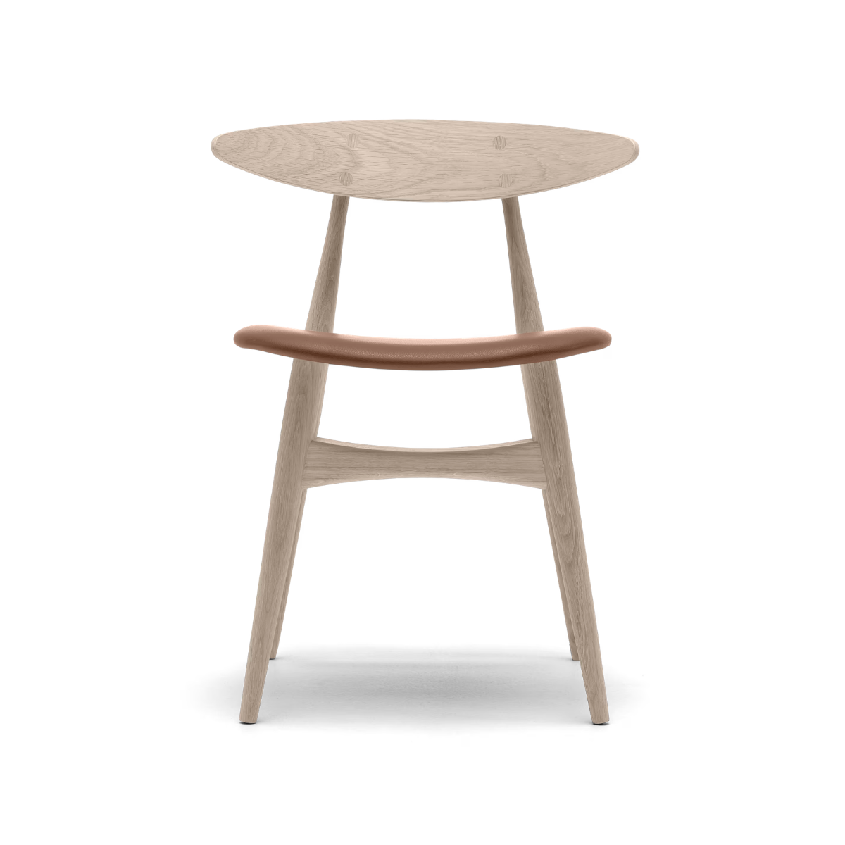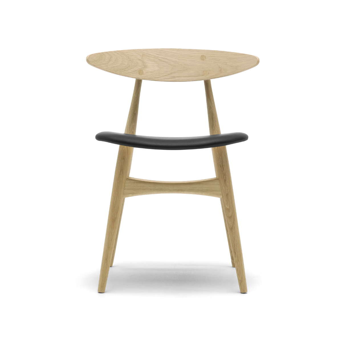 標誌性的弧形靠背採模壓成型夾板製作,表面可見圓形木釘蓋,是 Wegner 將工藝細節轉化為設計語彙的一貫手法。正面看來輕薄優雅,結構卻十分紮實,支撐性與美感兼顧。