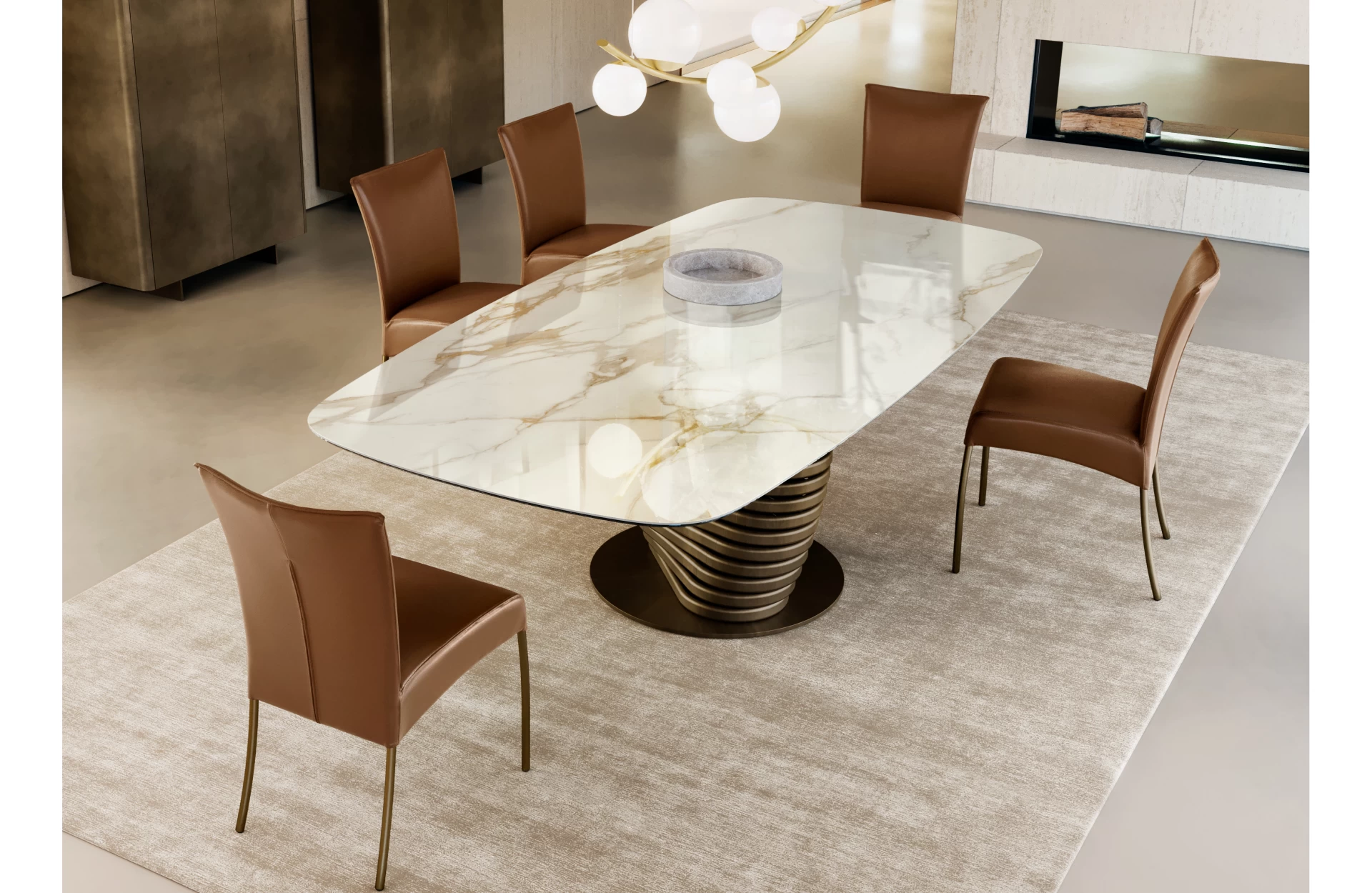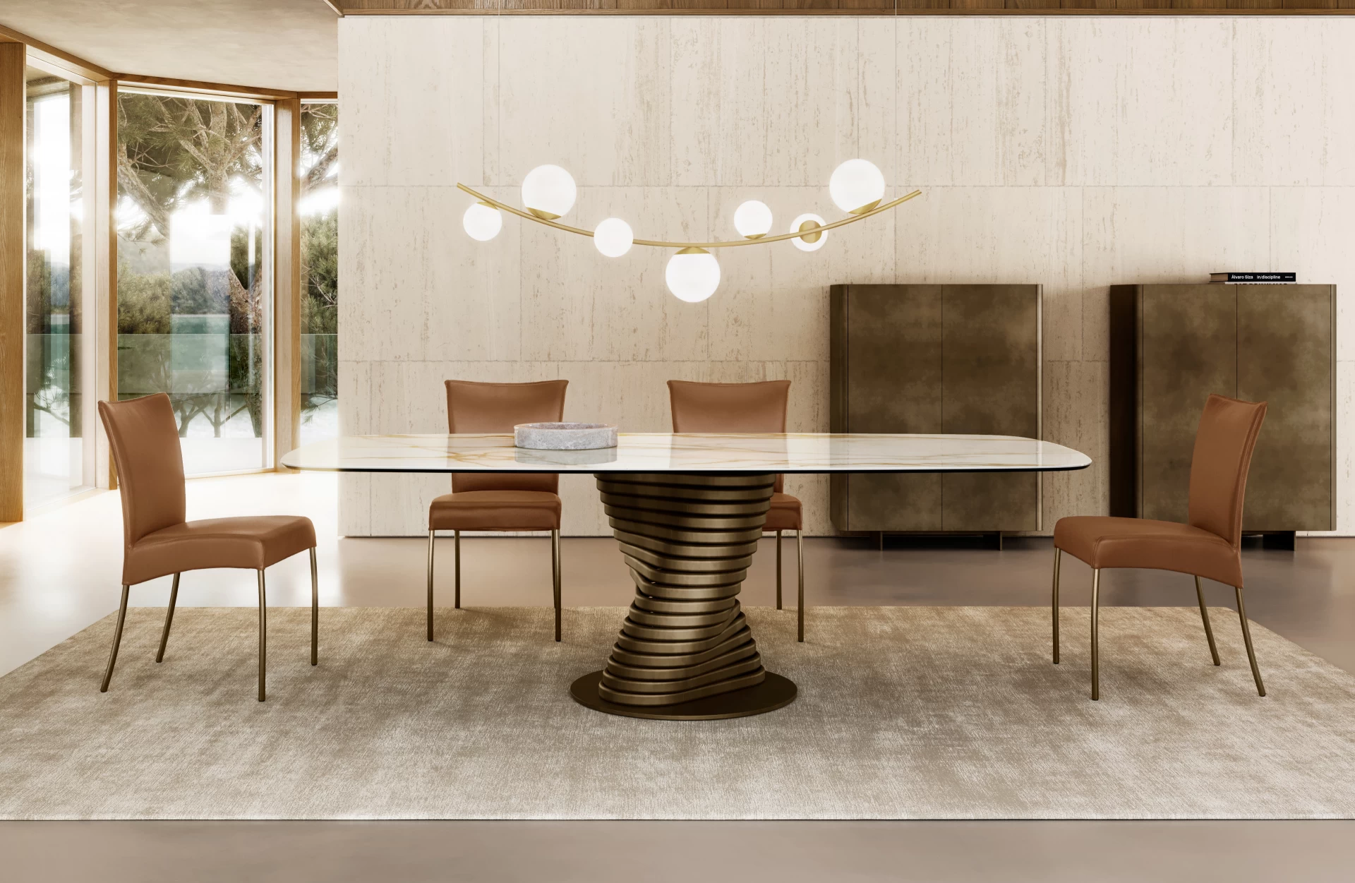 Rotolo 專為提升餐廳空間的獨特風格而設計,延續 Eforma 對細節和材料的重視,Rotolo 的陶瓷桌面是由 10 毫米厚的鋼化玻璃與 6 毫米厚的陶瓷層複合而成,確保了優異的質感與結構耐用性。