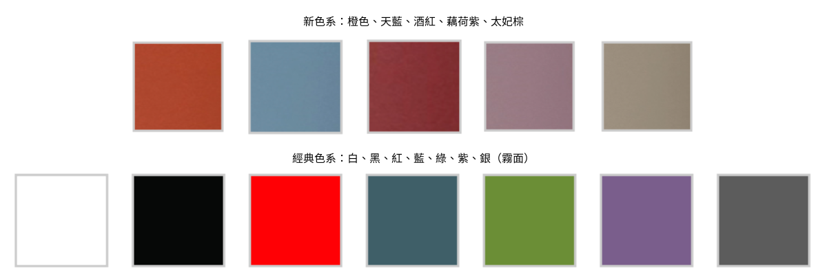 提供 12 款色彩,分為經典色系與新色系兩大系列: 經典色系:白、黑、紅、藍、綠、紫、銀(霧面) 新色系:橙色、天藍、酒紅、藕荷紫、太妃棕