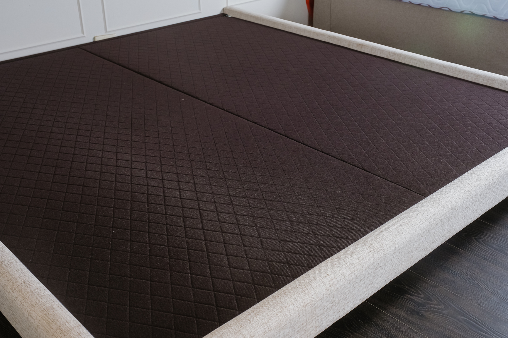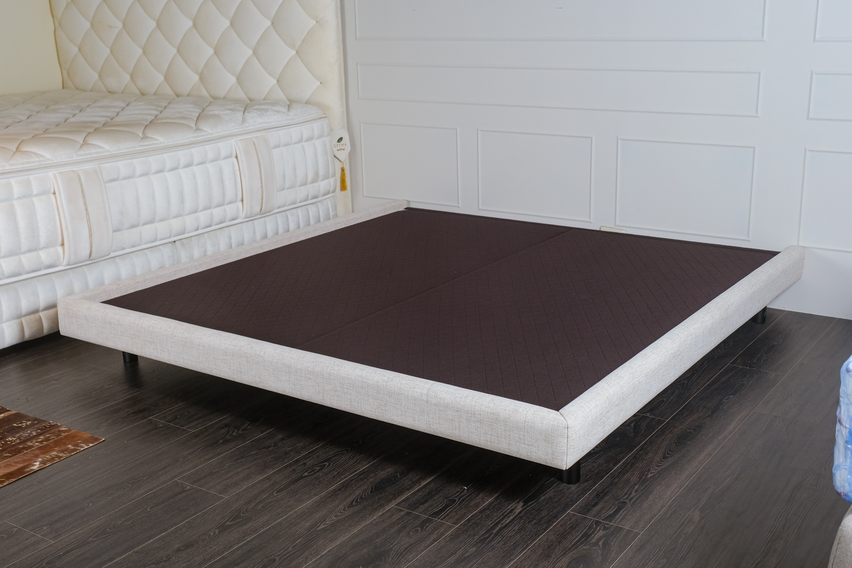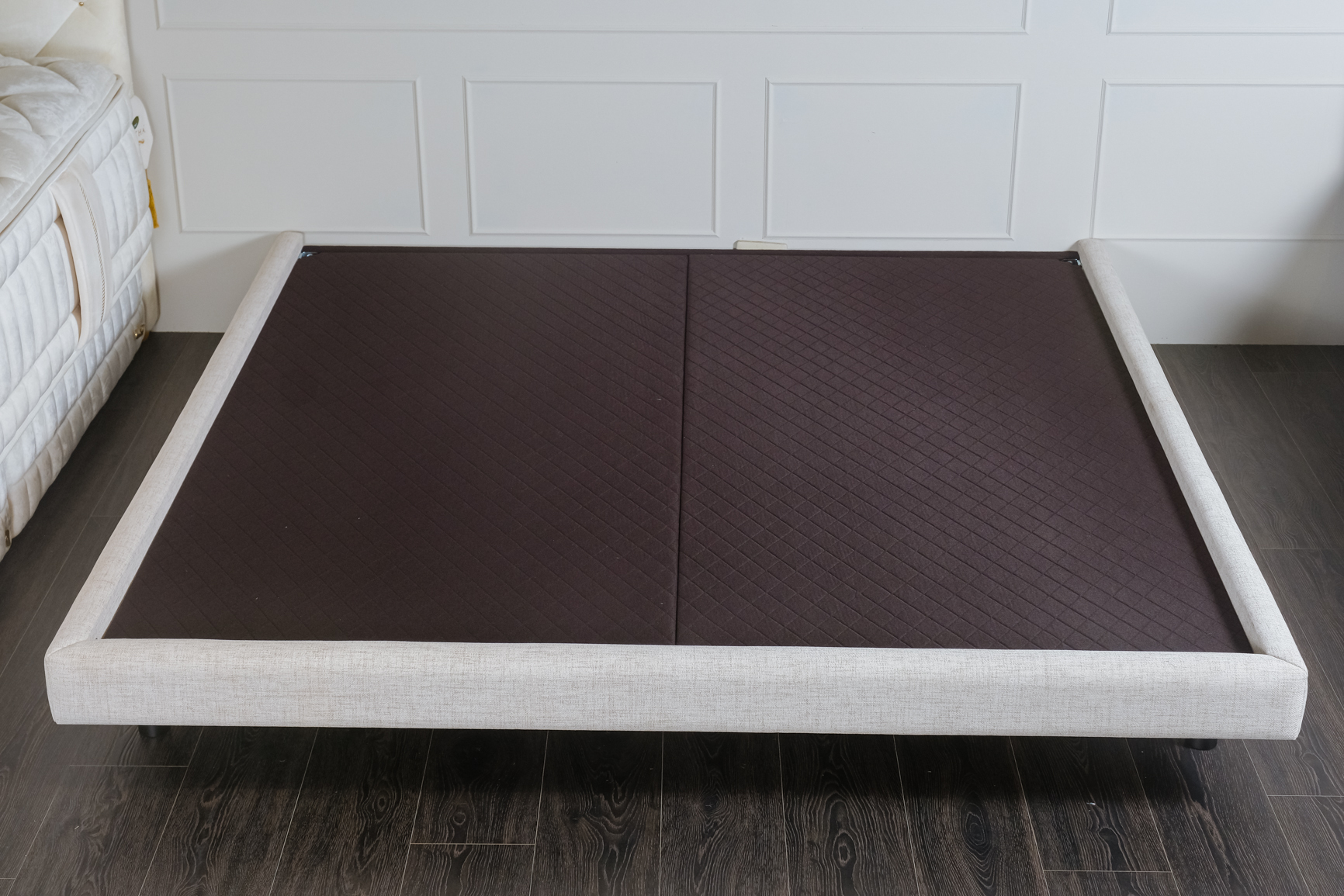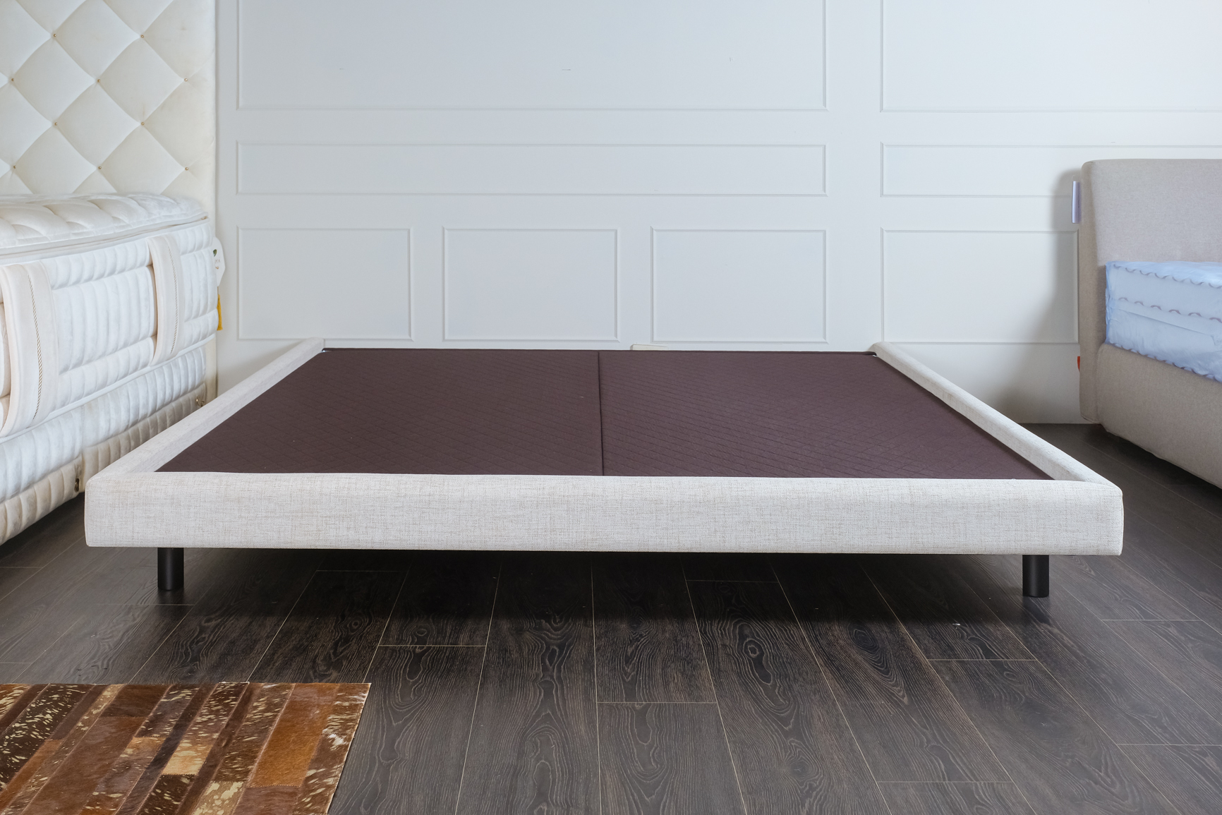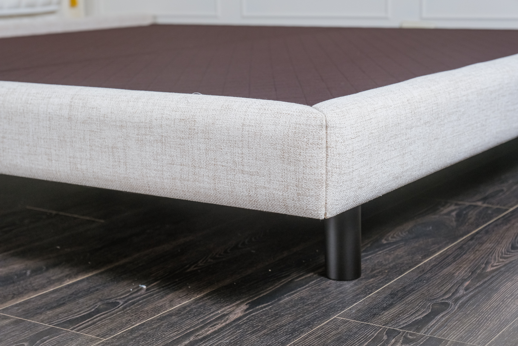 淺灰色系布料包覆床框,搭配黑色金屬圓腳,整體線條俐落不累贅,和任何風格的寢室都很合拍。