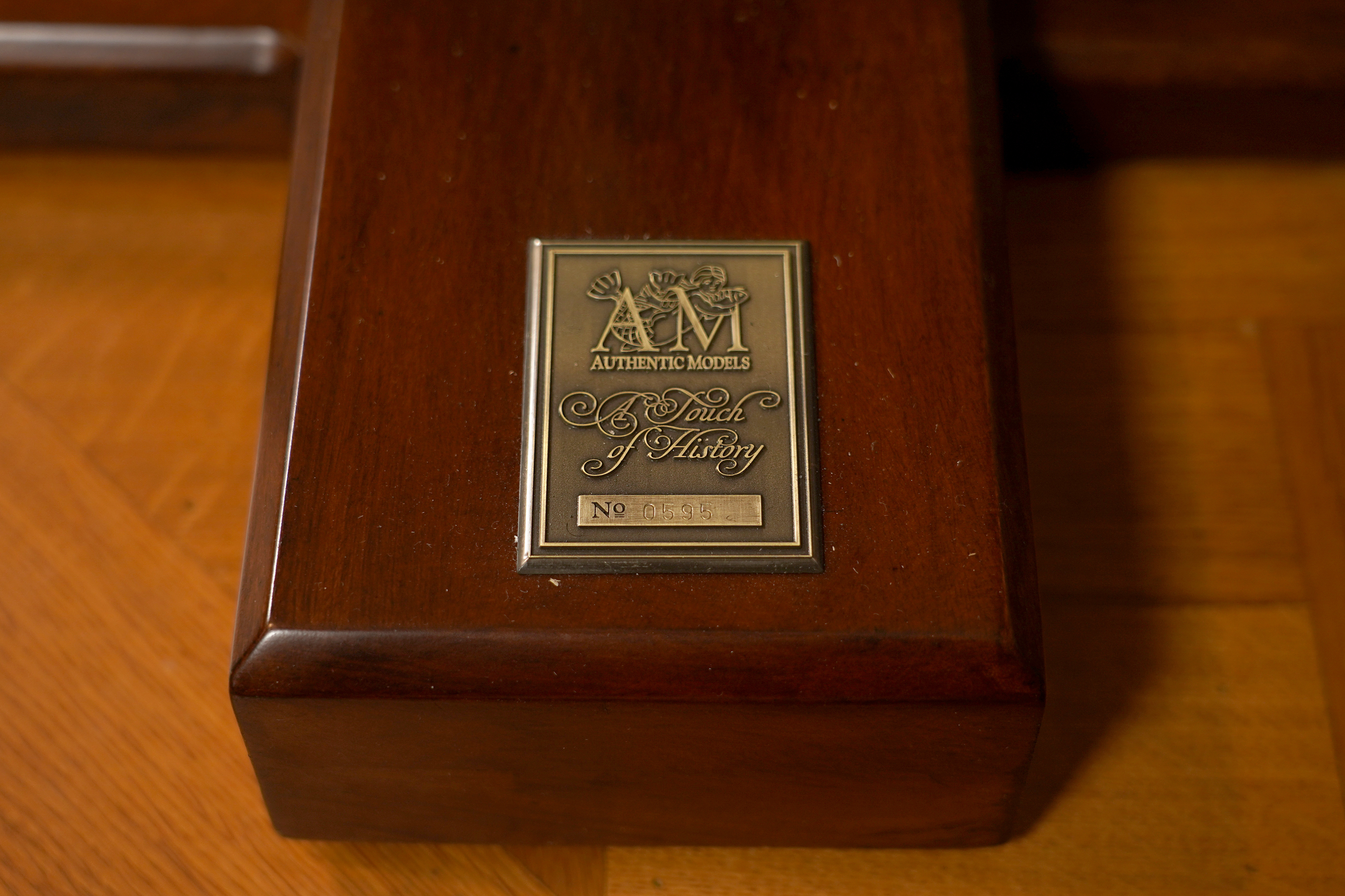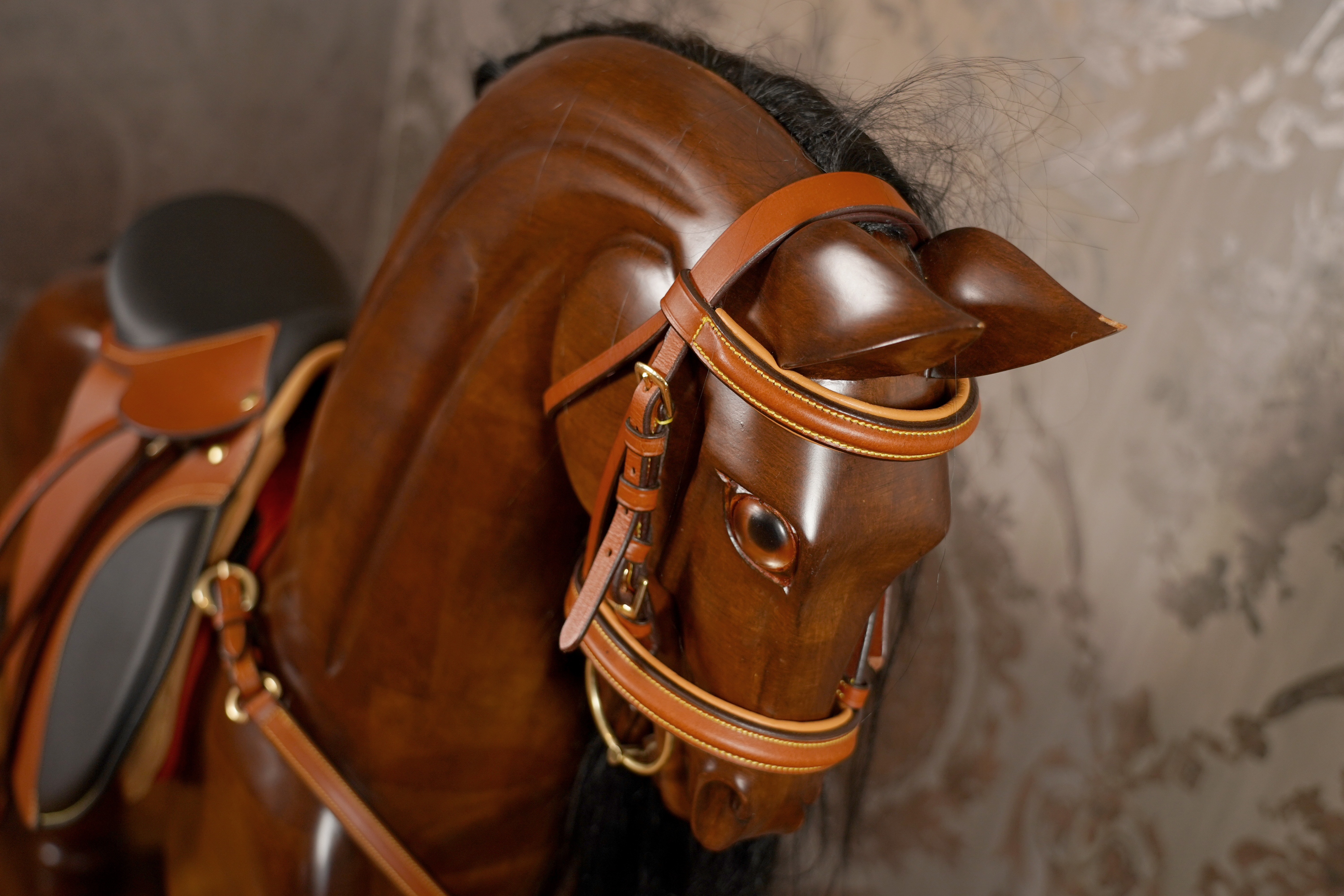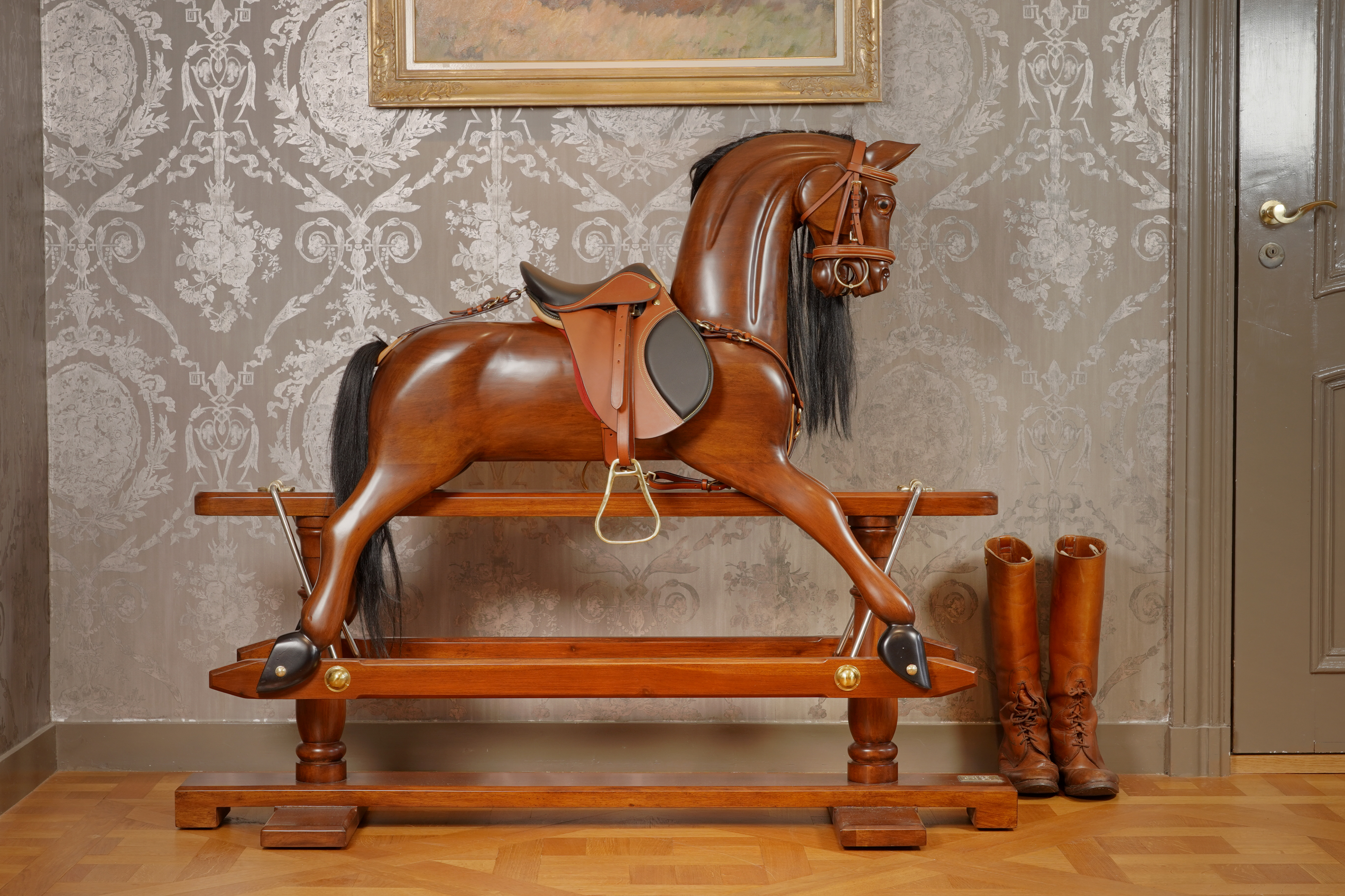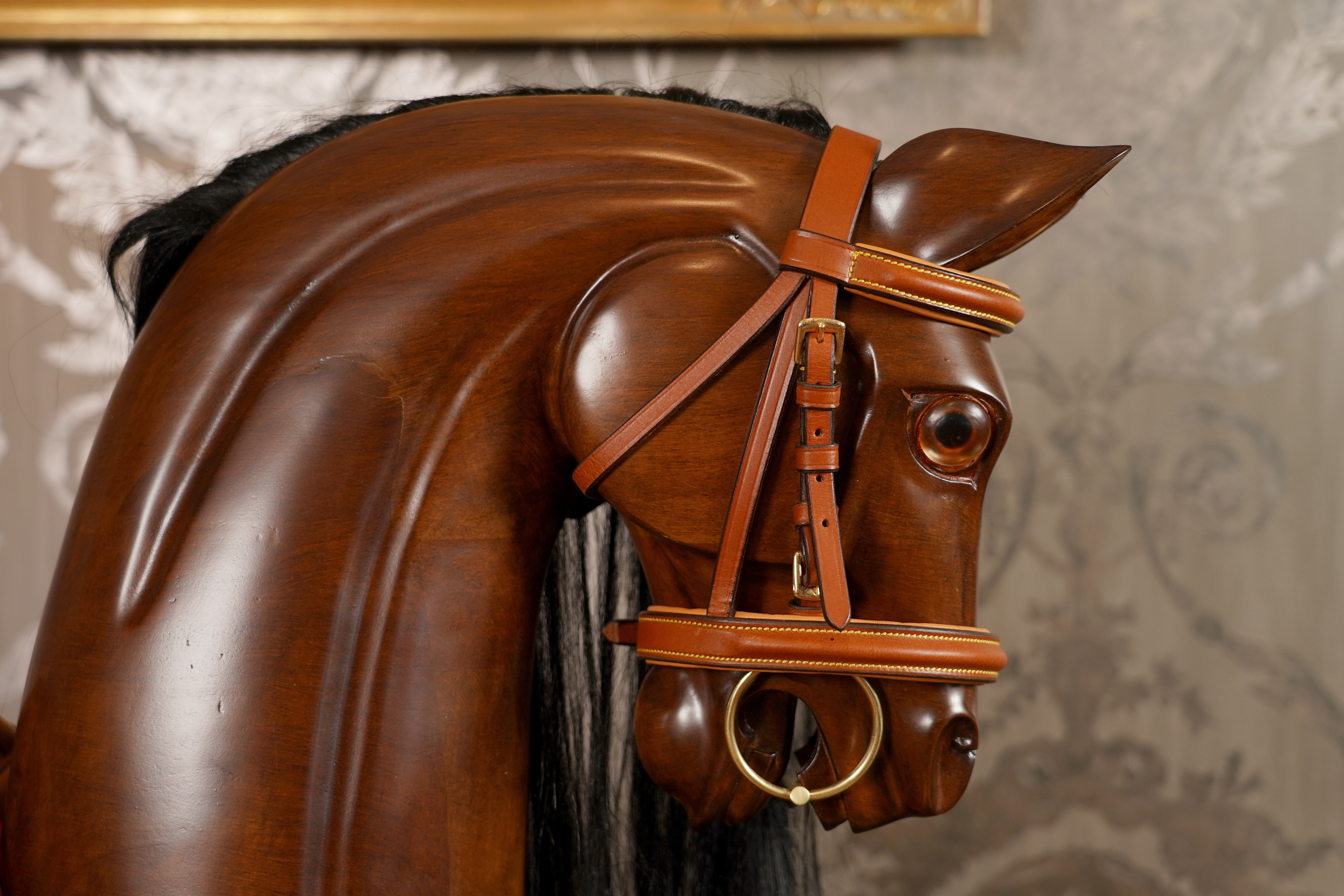 這個木馬模型是19世紀早期原裝樣品的全尺寸複製品。它採用了優質的桃花心木,由美國工匠手工雕刻製作,並搭配真皮馬鞍和馬具。外表經過手工精製,使用溫暖光澤的法式清漆,並經過刻意微做舊的處理,賦予它略帶歷史感的外觀。