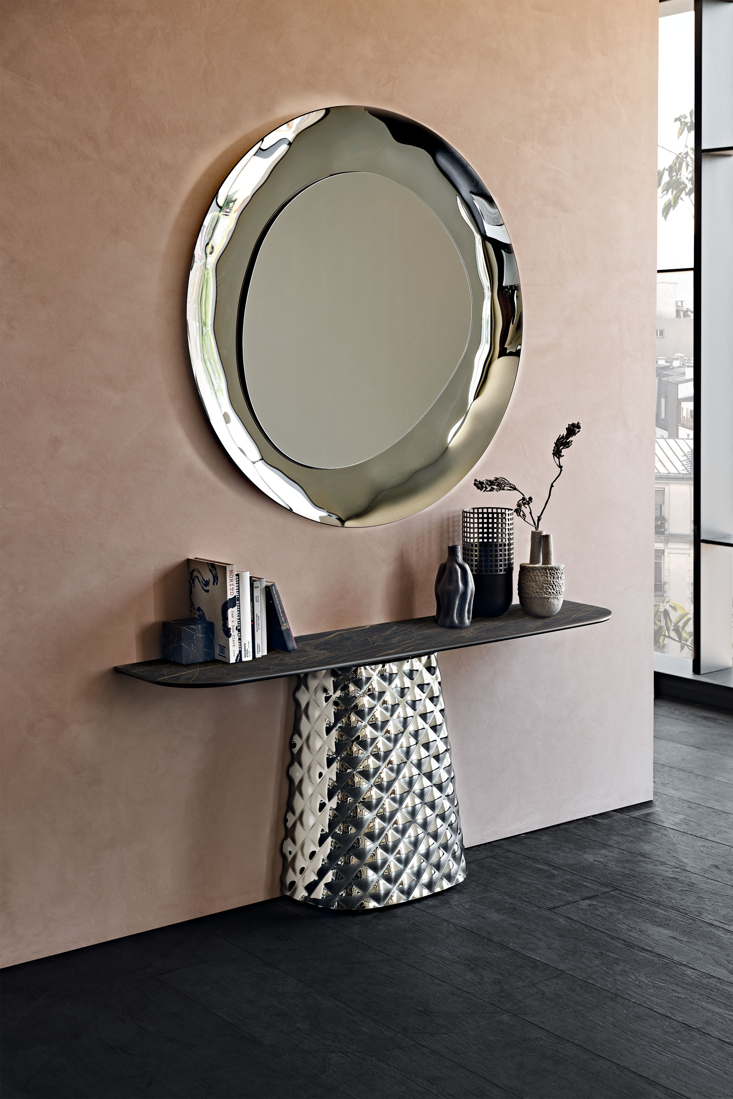 Atrium 系列餐桌有多種版本,可滿足最多樣化的美學需求,並為現代居家提供最佳裝飾。中央底座由兩塊精心製作的高級鏡面玻璃板組成。桌子創造出柔和的反射效果,周圍的物體和光源在其中產生迴響。玻璃採用前所未有的技術成型,使表面具有像織物上絎縫一樣的三維效果。