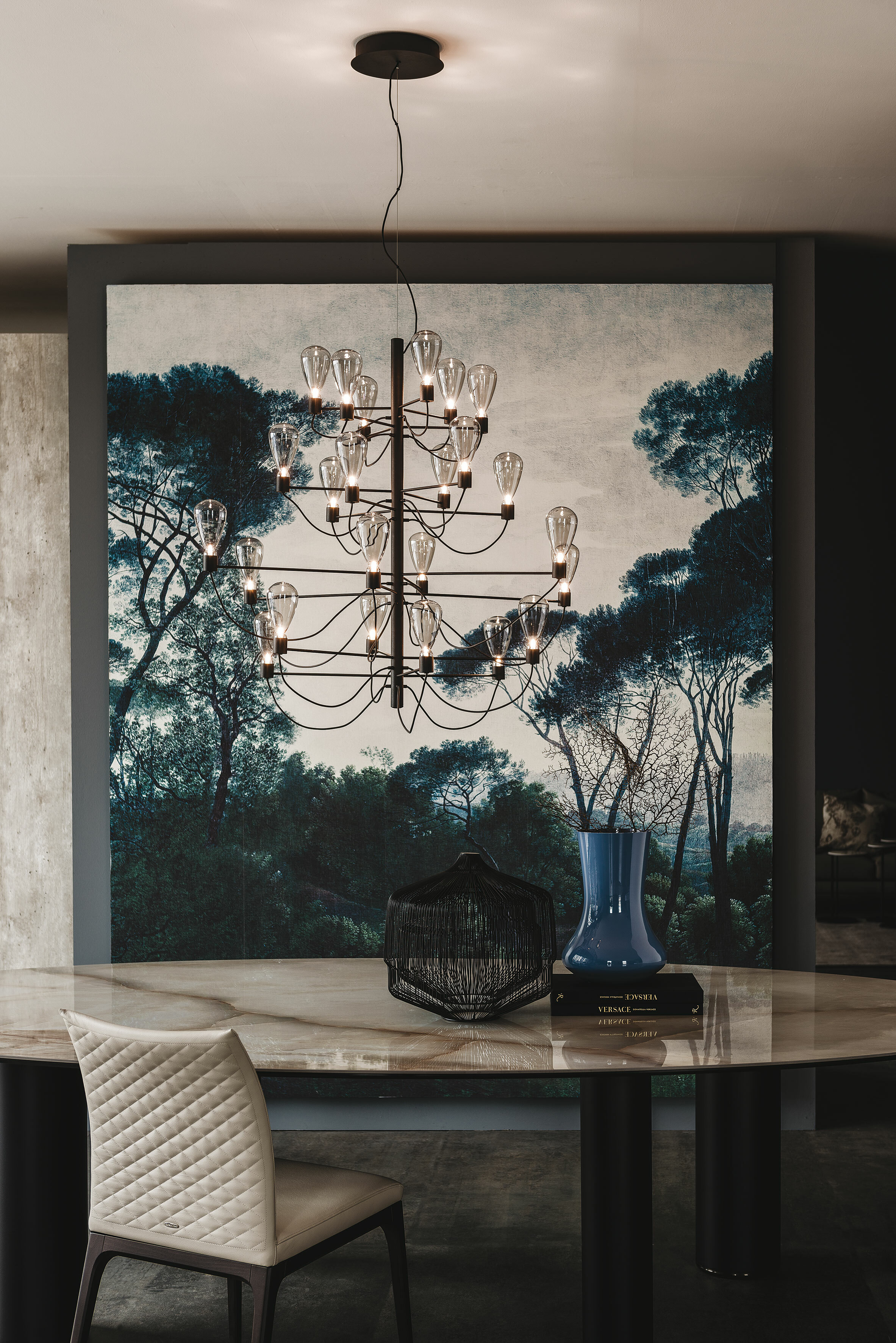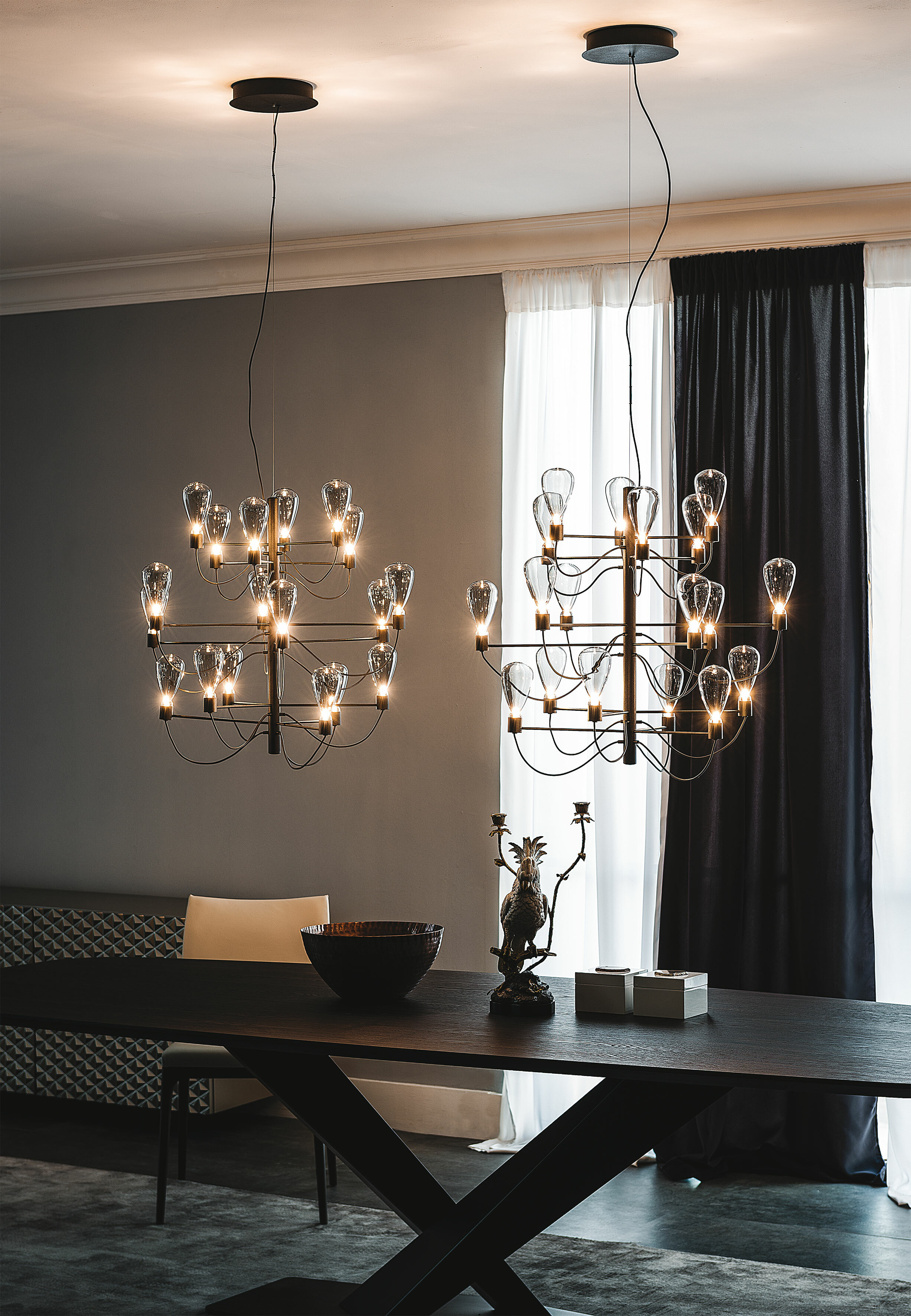 Poseidon 波賽頓,在希臘神話中為統治海洋的存在,手持三叉戟,掌握強大的力量,正好與這盞燈的外型不謀而合:多臂分支向上的結構如同三叉戟、自然呈現彎曲的電線如同海浪一般、從煙燻玻璃燈泡透出的柔和光芒,光源各自獨立、卻又相互輝映,如同變幻莫測的海洋世界。