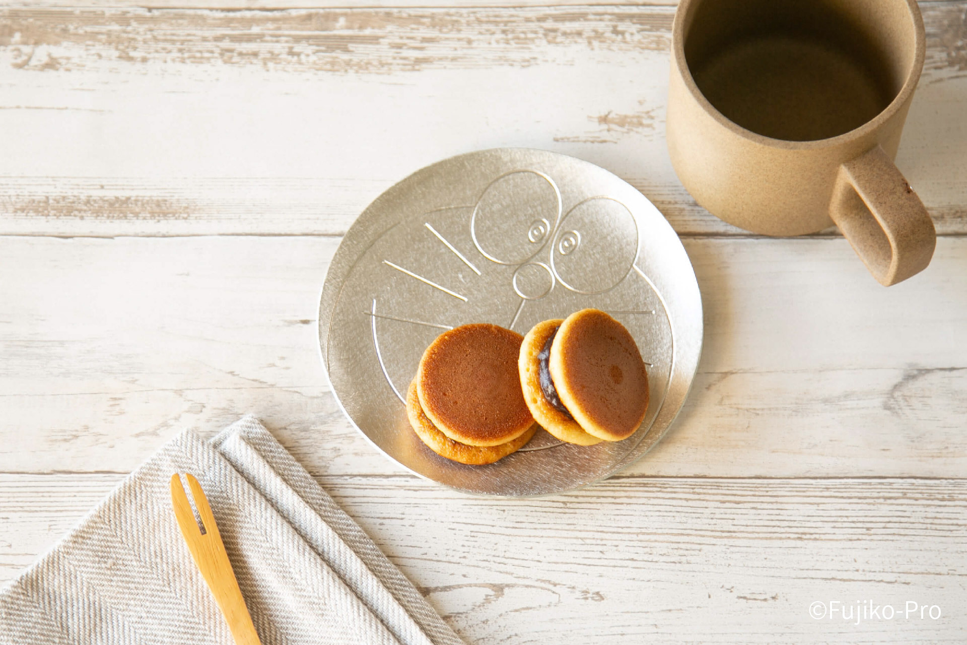 哆啦A夢的燦爛笑臉變身為純錫製小圓盤。因錫的導熱效果良好,預先將小圓盤放置在冰箱1-2分鐘,盤子很快就能變得冰涼,讓冷盤的料理更加美味。
