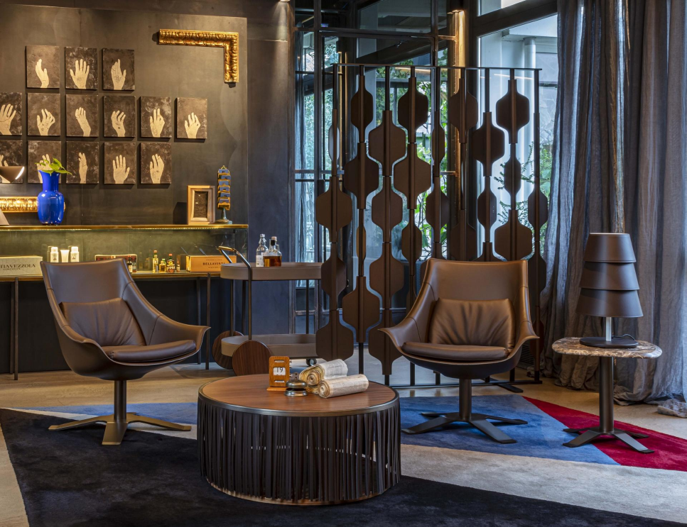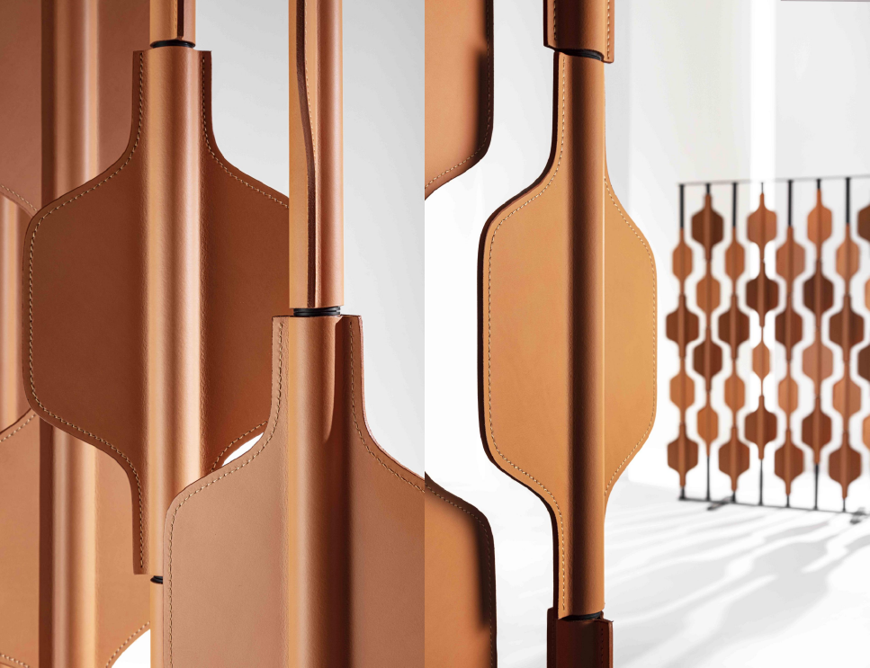 房間隔板採用塗漆鋁結構,可用模組覆蓋皮革或木材,可獨立旋轉。separé 的結構有 3 種標準尺寸可供選擇,並且可以適應您的空間。