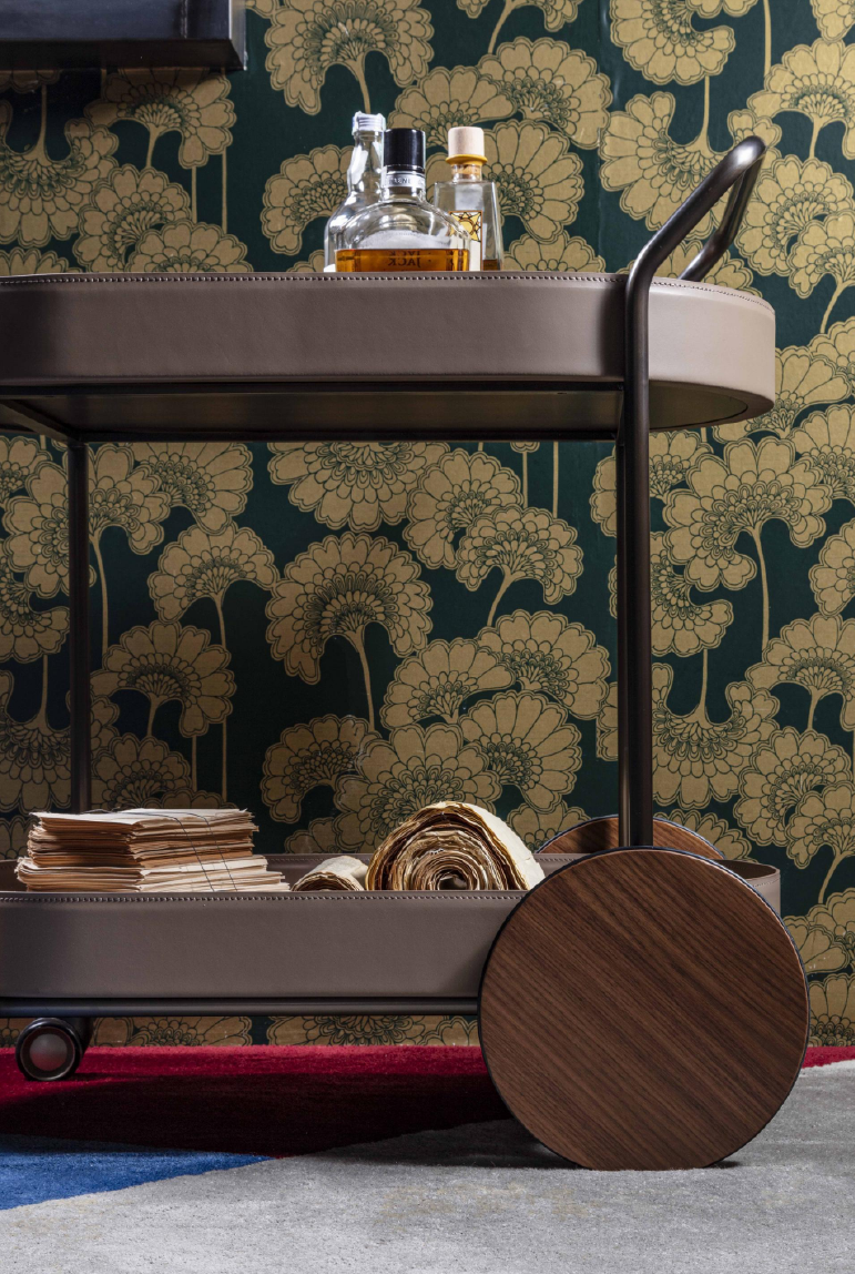 具有塗漆管狀金屬結構的推車。輪子和托盤為木質,邊緣覆蓋皮革。