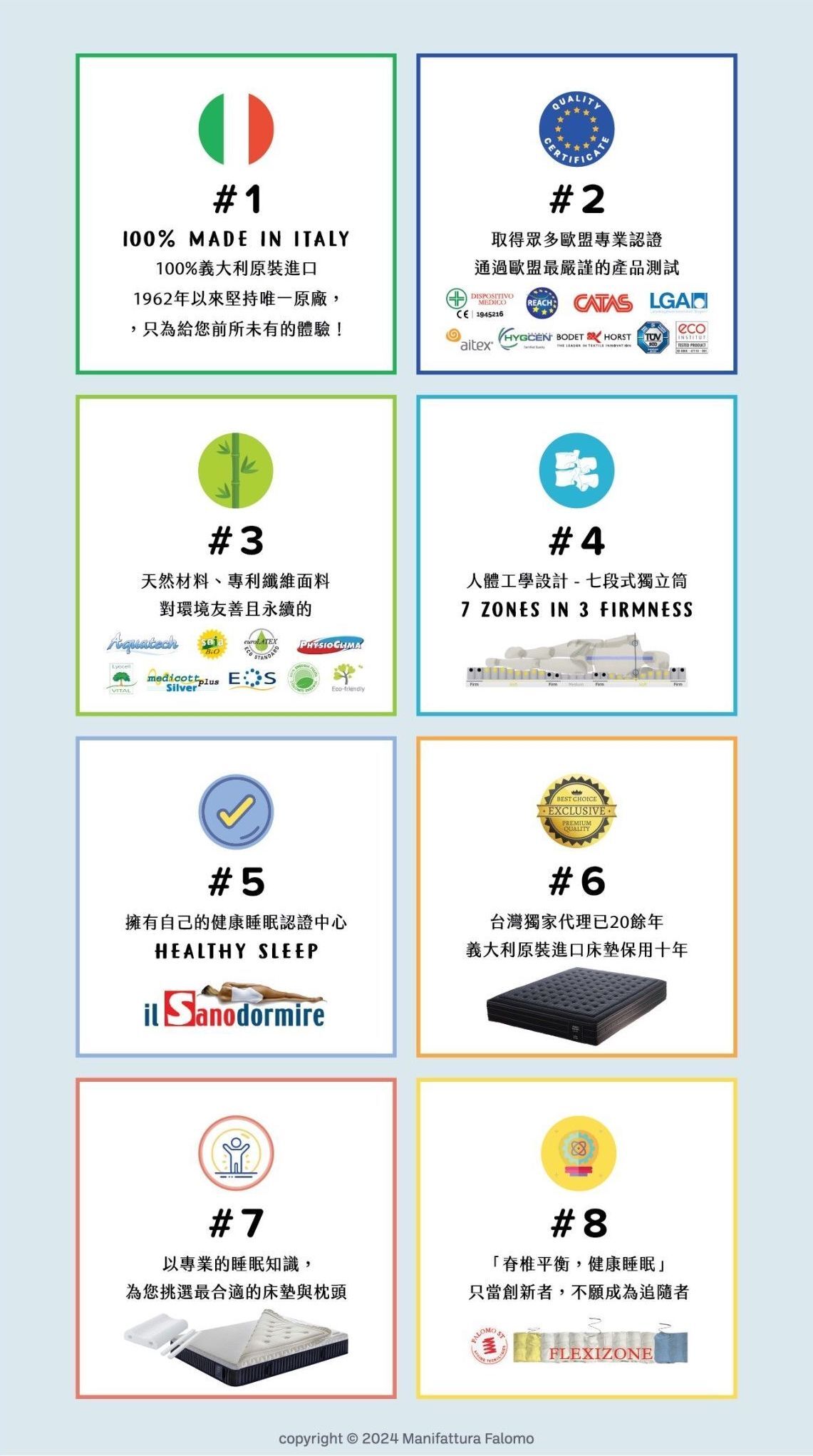 自 1962 年創立以來,Manifattura Falomo 以專業技術、創新思維與嚴謹態度,專注於打造每一張優質床墊,被譽為義大利「健康睡眠」的代表品牌,並在國際間享有極高聲譽,累積了無數幸福與滿意的使用故事。從原料篩選、研發、生產到包裝與運送,Falomo 堅持全程於義大利原廠製作,維持 100% 義大利手工工藝品質。品牌通過歐盟多項高標準認證與嚴格產品測試,確保所有材料皆對人體與環境無害,並具備優異的耐用性。