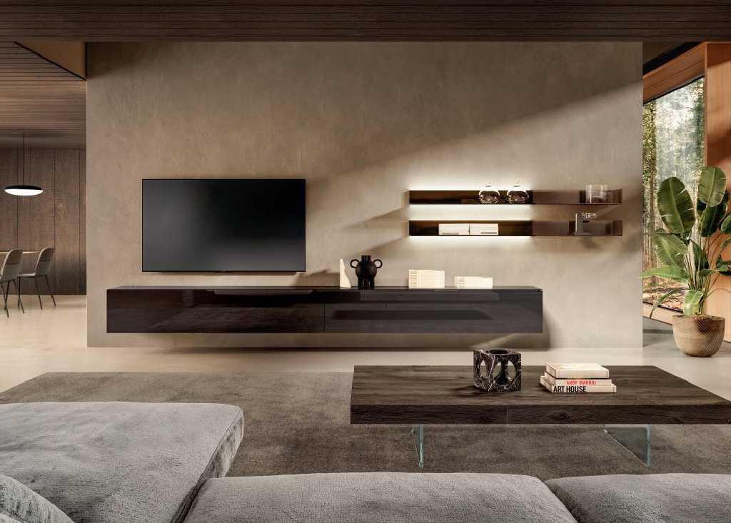 這款創新的客廳牆櫃的獨特之處在於其隱藏式工藝,可支撐看似懸臂式的玻璃架。Cartesio 創造出引人注目的浮動效果。在對滿空間和空空間的有趣探索中,架子的三個幾乎看不見的側面相交,似乎漂浮在空中。帶有 Cartesio 層架的特色牆櫃可安裝照明,並且有不同版本,將 Extrachiaro、Fumé Grigio 或 Fumé Bronzo 玻璃飾面的透明效果與漆玻璃或 XGlass 的色調相結合。