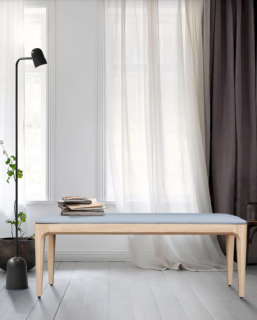 Cozy 實木長凳為系列的新進成員,除了椅腳部分沿襲 Cozy 系列的設計語彙,為搭配餐桌而設置的舒柔超纖皮柔軟坐墊,採用高密度泡棉填充,令人宛如身處和室的塌塌米之上,提供絕佳的舒適度,同時也提升了整體日式氛圍。